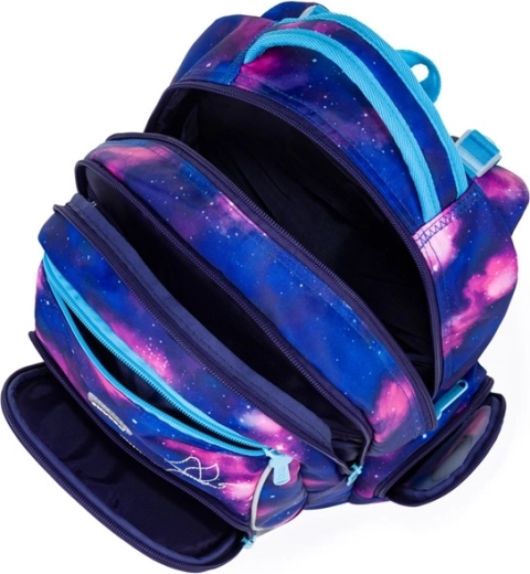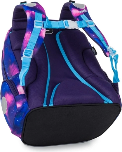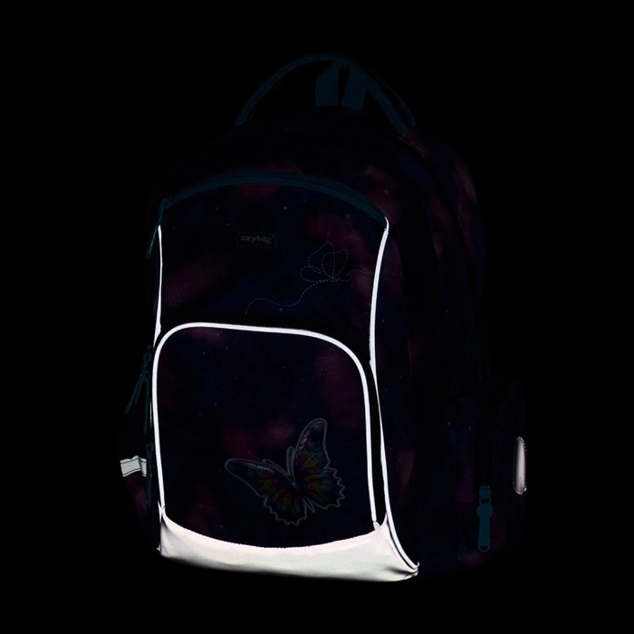 Rucsac școlar stilat pentru clasele primare, cu motiv de fluture și galaxii, oferă spate ergonomic și respirabil, bretele reglabile cu cârlige suplimentare, construcție ușoară și organizare internă bogată. Datorită elementelor reflectorizante mărește siguranța, fundul rigid impermeabil protejează împotriva umezelii și murdăriei, iar volumul de 22 l oferă suficient spațiu pentru manuale și lucruri de timp liber.
