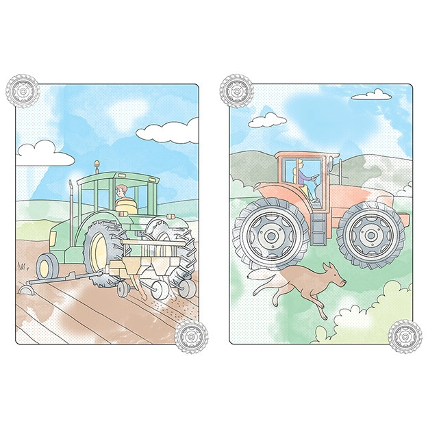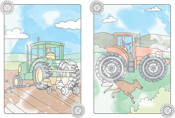 - 8 imagini magice cu tematică de tractoare și utilaje agricole.
