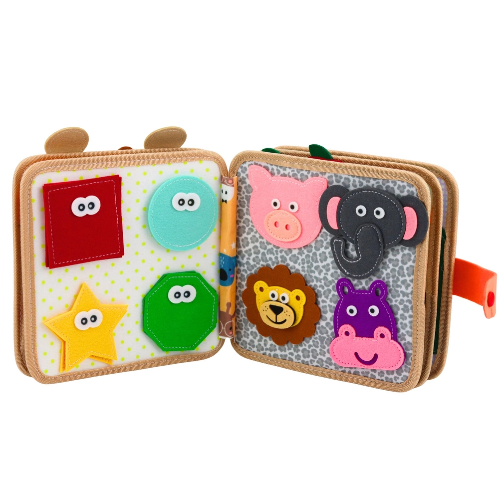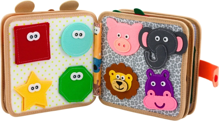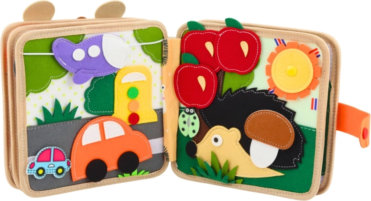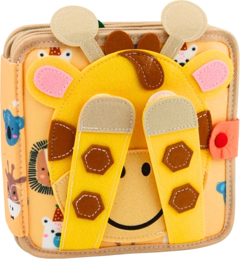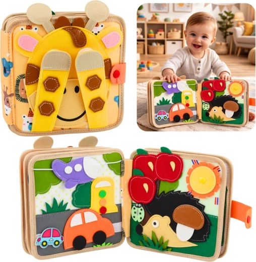 Cartea moale din fetru senzorial cu girafă pe copertă oferă copiilor diverse elemente interactive care susțin motricitatea fină, coordonarea mână–ochi și învățarea culorilor și formelor. Datorită pieselor mobile și detașabile și scenelor colorate, copiii se joacă și în același timp își dezvoltă inteligent abilitățile – acasă, la grădiniță și în călătorii.