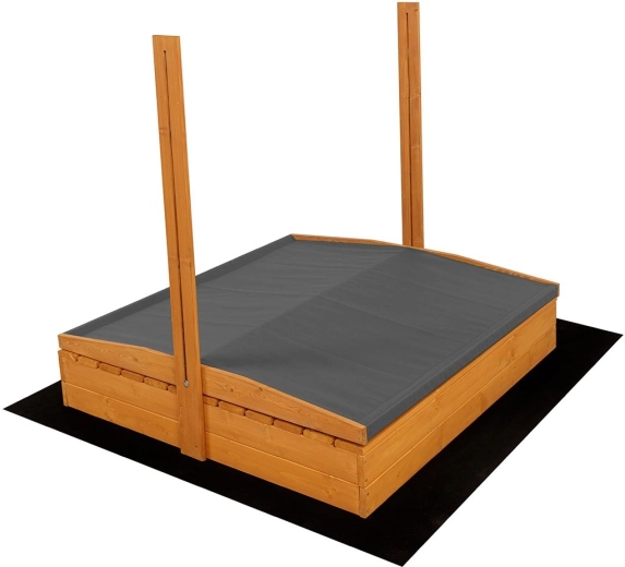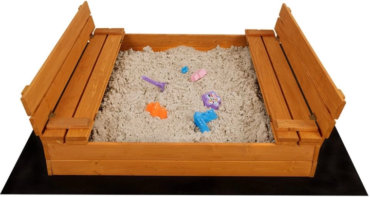 Construcția din lemn stabilă, cu muchii șlefuite fin și rotunjite, oferă un mediu sigur pentru micii constructori. Băncile servesc ca loc de ședere confortabil în timpul jocului și, prin rabatare, formează un capac de protecție care împiedică pătrunderea murdăriei și a animalelor.