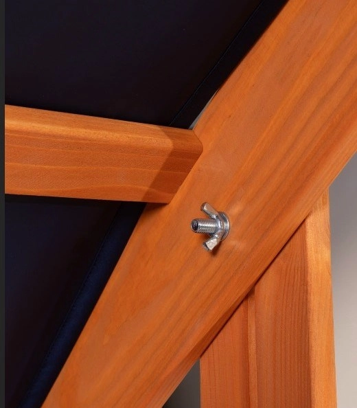 Copertina textilă rezistentă, cu posibilitatea de reglare a înălțimii și a unghiului, oferă umbră în timpul jocului și, după închidere, acoperă întreaga suprafață a lăzii de nisip.