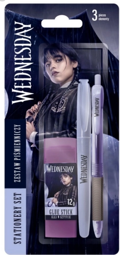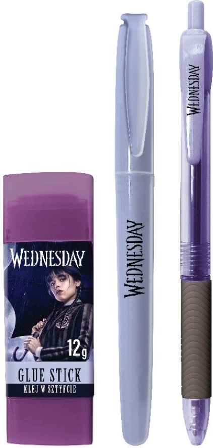 Set de scris stilat cu motiv WEDNESDAY pentru școală și birou. Conține pix cu cerneală albastră (vârf 0,5 mm), liner subțire pentru scriere precisă (linie 0,4 mm) și lipici corector 8 g pentru lipire rapidă și curată.