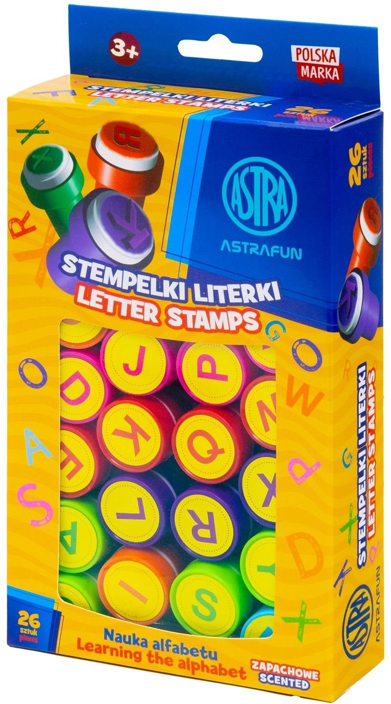 Setul de ștampile parfumate ASTRA este o unealtă ideală pentru preșcolari și școlari. Copiii exersează literele într-un mod jucăuș, formează cuvinte și își dezvoltă motricitatea fină. Fiecare ștampilă este prevăzută cu capac, astfel încât se depozitează ușor și cerneala nu se usucă.