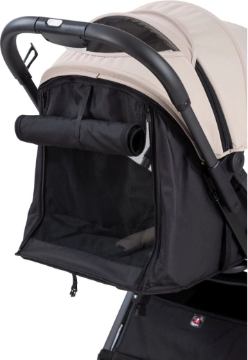 Căruciorul este echipat cu centuri în 5 puncte, bară de siguranță detașabilă și un coș de depozitare practic, cu o capacitate de până la 3 kg. Întreținerea ușoară și mânerul din material EVA adaugă confort în utilizarea zilnică. Construcția îndeplinește standardul EN 1888-2:2018+A1:2022, astfel încât vă puteți baza pe siguranță certificată.