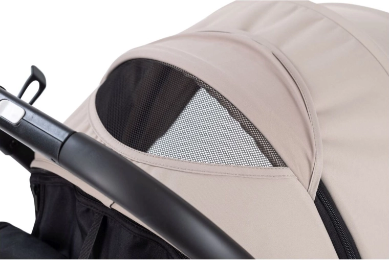 Capotina ajustabilă cu fereastră din plasă asigură circulația aerului și vă permite să supravegheați copilul și în timpul mersului.