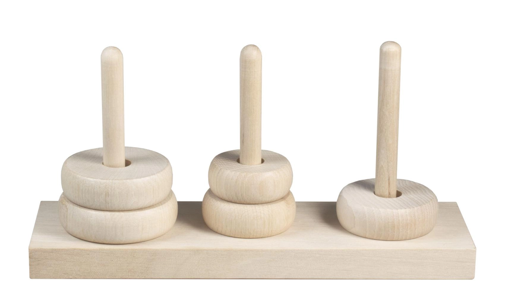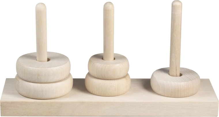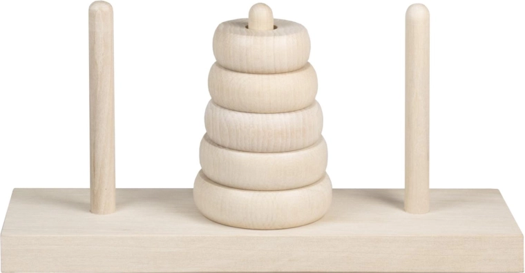 Turnul din Hanoi este un puzzle matematic clasic din 1883, care distrează și educă generații de jucători. Scopul este să mutați toate inelele de pe un țăruș pe altul respectând reguli simple – se poate muta doar un singur inel o dată, iar un inel mai mare nu poate fi așezat peste unul mai mic. Această versiune din lemn oferă un aspect natural, o bază solidă și inele netede pentru manipulare confortabilă.
