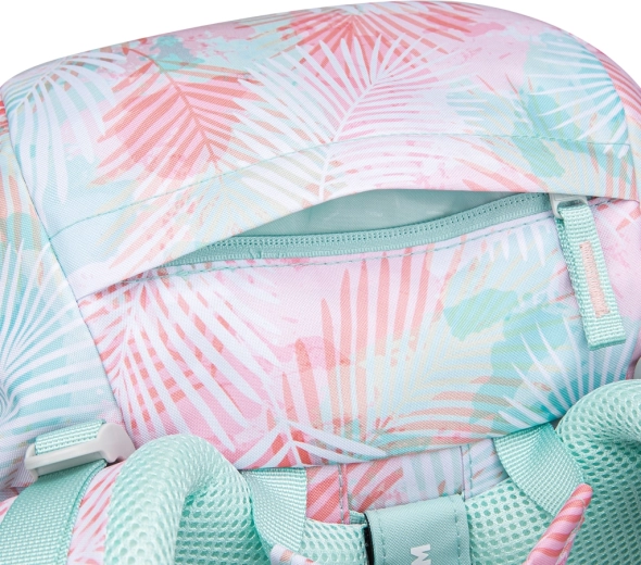 Capacul magnetic se închide singur printr-un clic și grăbește manipularea. Compartimentul principal cu organizator și plăci ușoare protejează caietele, iar buzunarul frontal termic păstrează gustarea proaspătă mai mult timp.
