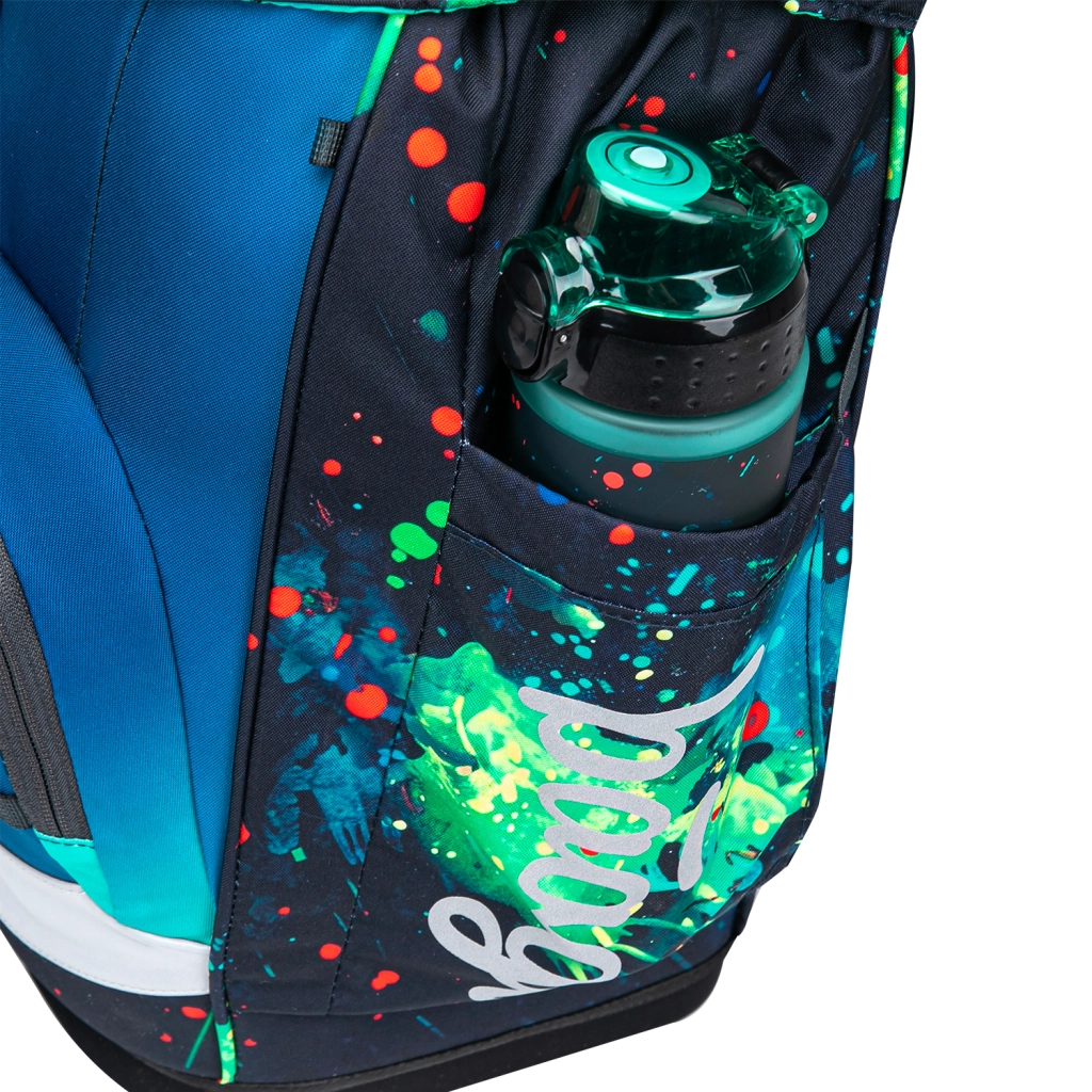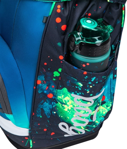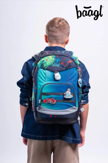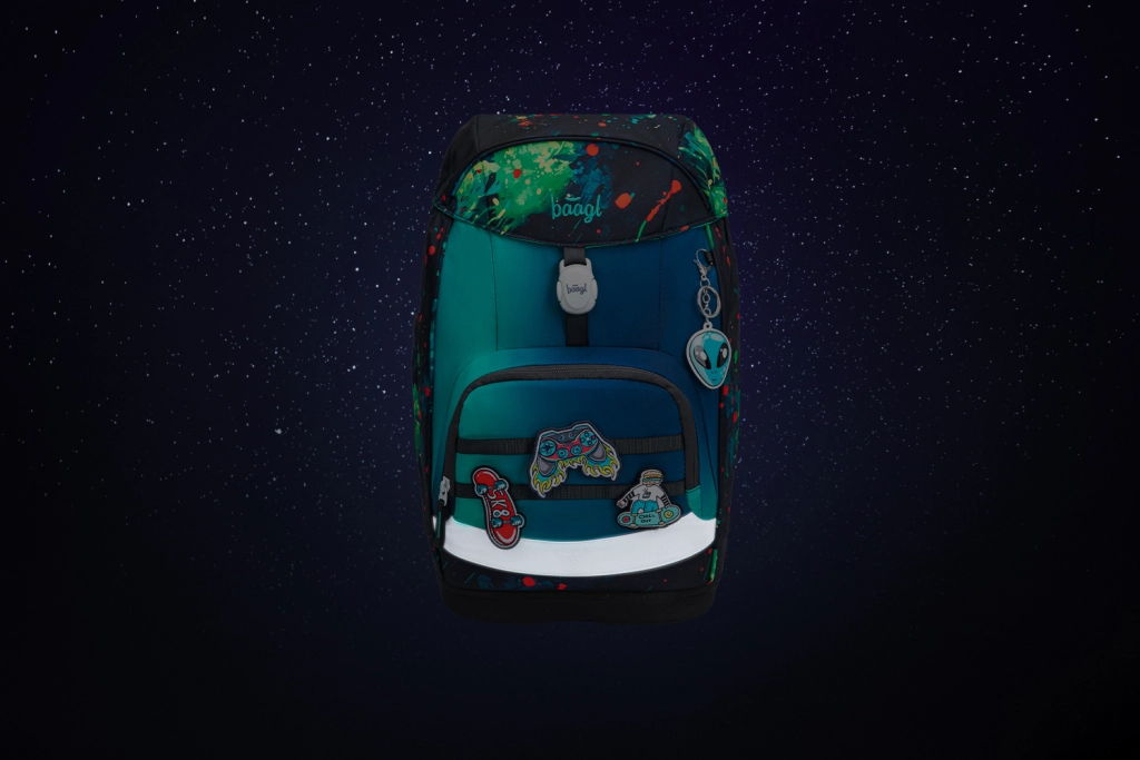 Echiparea practică include compartiment principal cu organizator, plăci ușoare din plastic pentru protecția caietelor, buzunar frontal termo pentru gustare și capac superior cu închidere magnetică care se auto-închide. Materialul este recilcat și impermeabil cu certificare GRS și completat de elemente reflectorizante. Designul jucăuș poate fi personalizat cu insigne interschimbabile Baaglies. Setul include penar cu un singur compartiment cu fermoar YKK de calitate, elastice pentru instrumente de scris și fereastră pentru orar, precum și un săculeț multifuncțional cu buzunar frontal cu fermoar pentru încălțăminte sau echipament sportiv.
