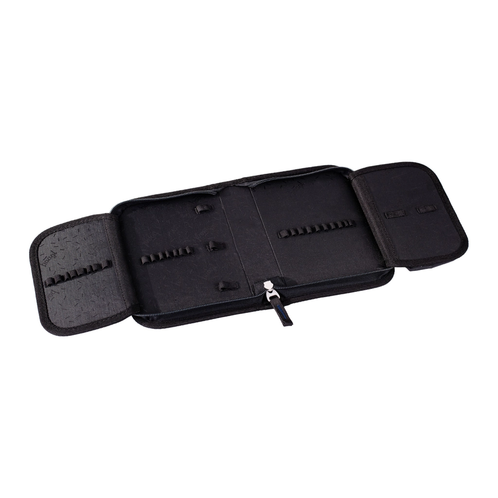 Setul include un penar cu un singur compartiment cu două clape, fermoar YKK rezistent, buzunărel pentru mărunțișuri, fereastră pentru orar și elastice ferme potrivite și pentru creioane triunghiulare (livrat fără conținut). Săculețul pentru papuci sau sport are o carabinieră practică pentru prindere de rucsac. Întregul set este realizat din materiale reciclate și îndeplinește certificarea GRS, cu accent pe siguranță datorită elementelor reflectorizante.