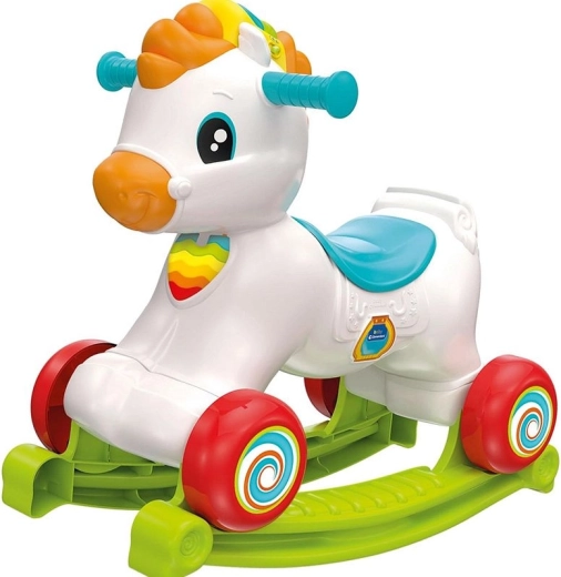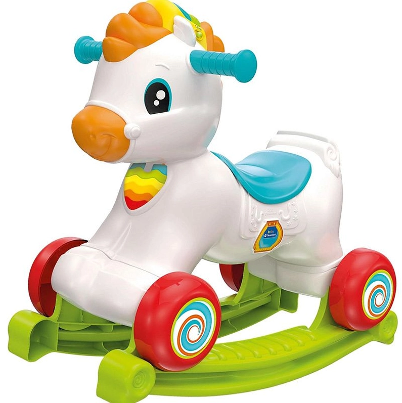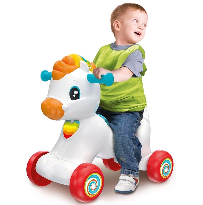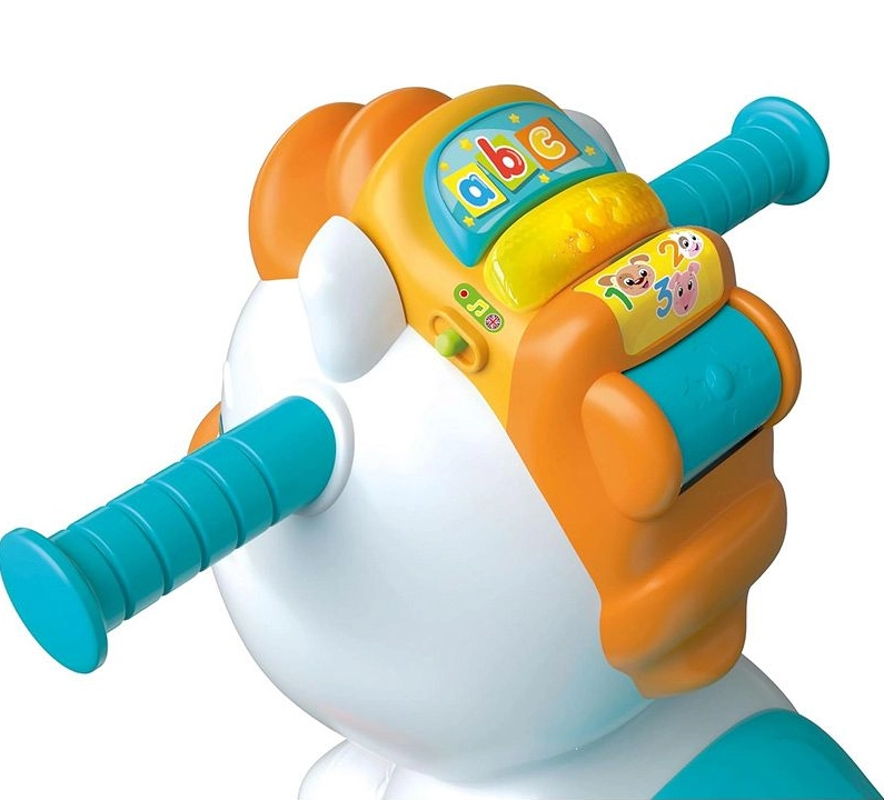 Drăgălașul căluț 3în1 îmbină balansorul, împingătorul/antemergătorul și centrul interactiv de activități. Datorită senzorilor inteligenți reacționează la mișcare, redă sunete realiste, vesele poezioare și cântecele, îi învață pe cei mici litere, animale și numere cu ajutorul cilindrului rotativ. Susține dezvoltarea echilibrului, a motricității fine și grosiere și oferă învățare a limbii engleze. Greutate maximă suportată 20 kg, ideal pentru copii de 12–36 luni.