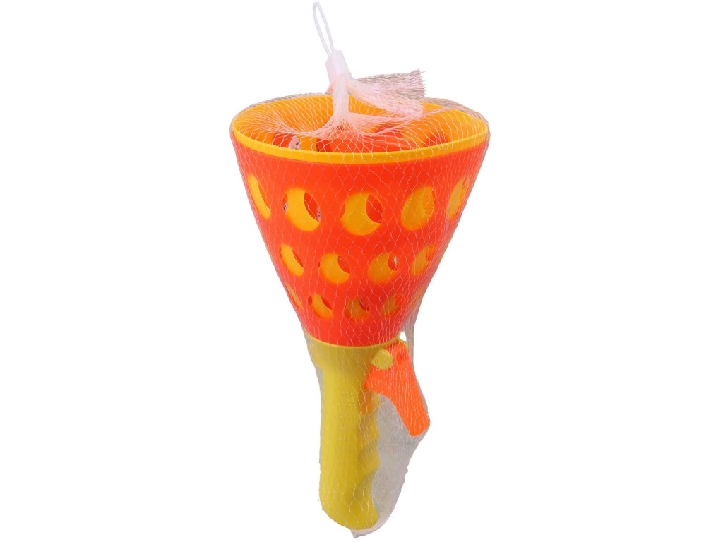 Descoperiți un joc simplu și captivant care îi ridică pe copii de pe scaun. Construcția ușoară din plastic, cu coșuleț perforat, facilitează prinderea și lansarea mingiuței, astfel încât se vor bucura atât începătorii, cât și jucătorii mai îndemânatici. Setul include 2 coșulețe colorate, astfel încât copiii pot începe imediat competiția în perechi.