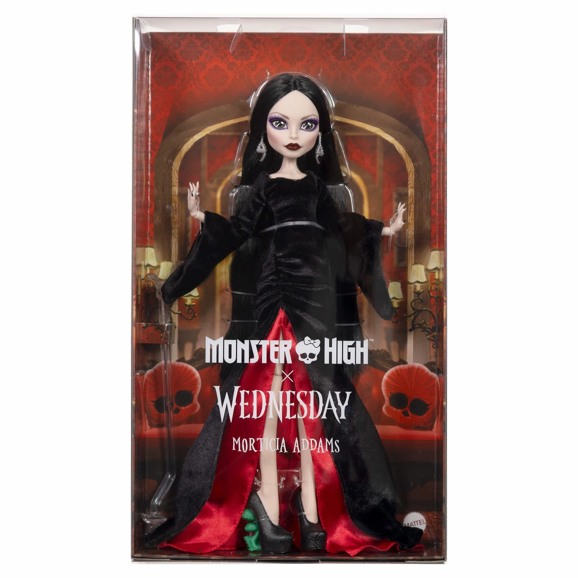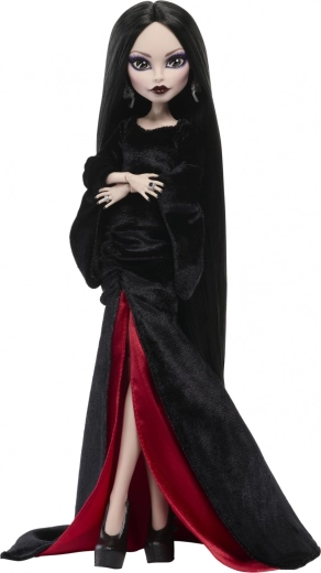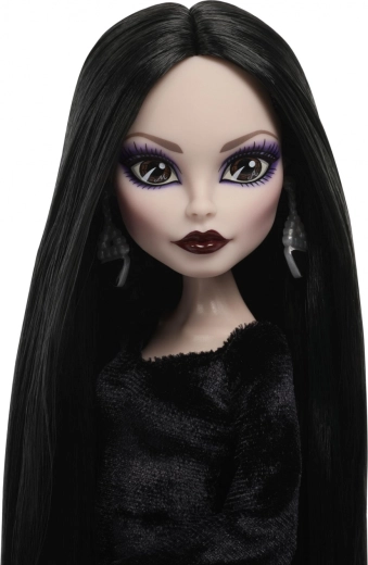 Descoperă eleganța întunecată a celebrei personaje MORTICIA ADDAMS în colecția Monster High Collector. Păpușa impresionează prin rochia lungă neagră cu mâneci largi dramatice, textură catifelată și accente roșii în despicătură. Părul implantat (rooted), tenul palid și machiajul pronunțat subliniază aspectul autentic cunoscut din serialul WEDNESDAY.