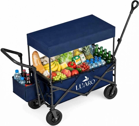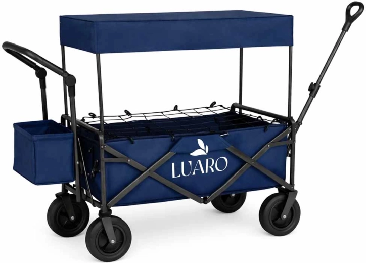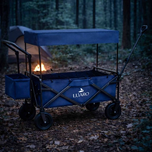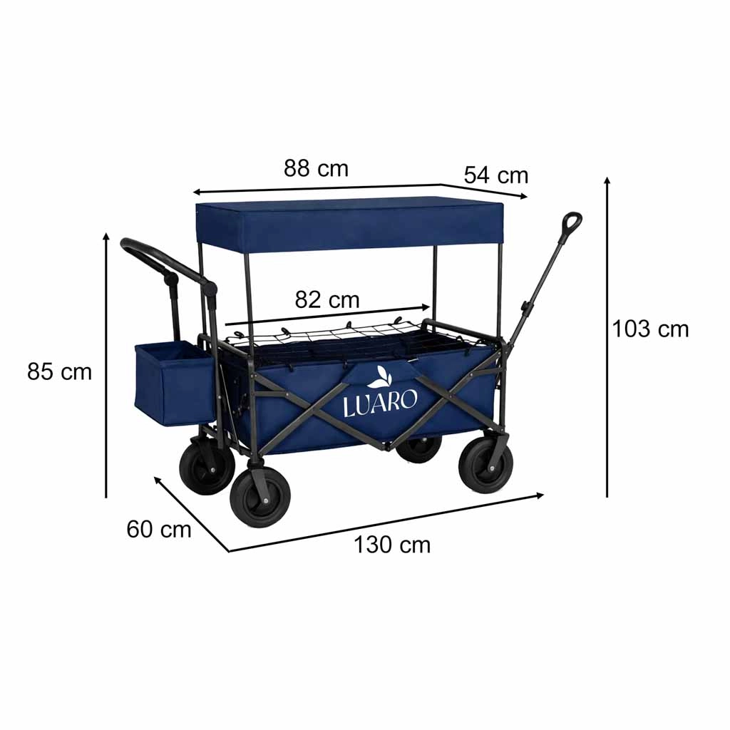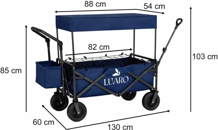 Cu căruciorul LUARO obțineți un ajutor de încredere pentru excursii în familie, zile la plajă și camping. Cadrul solid din oțel și țesătura Oxford 600D durabilă asigură stabilitate și durată lungă de viață, în timp ce roțile mari pentru teren fac față nisipului, ierbii și pavajului. Căruciorul poate fi tras sau împins, iar datorită mânerelor cu înălțime reglabilă se adaptează confortabil la statura dvs.
