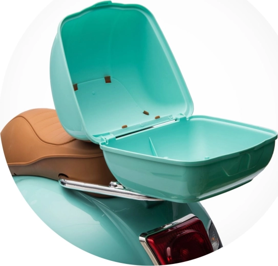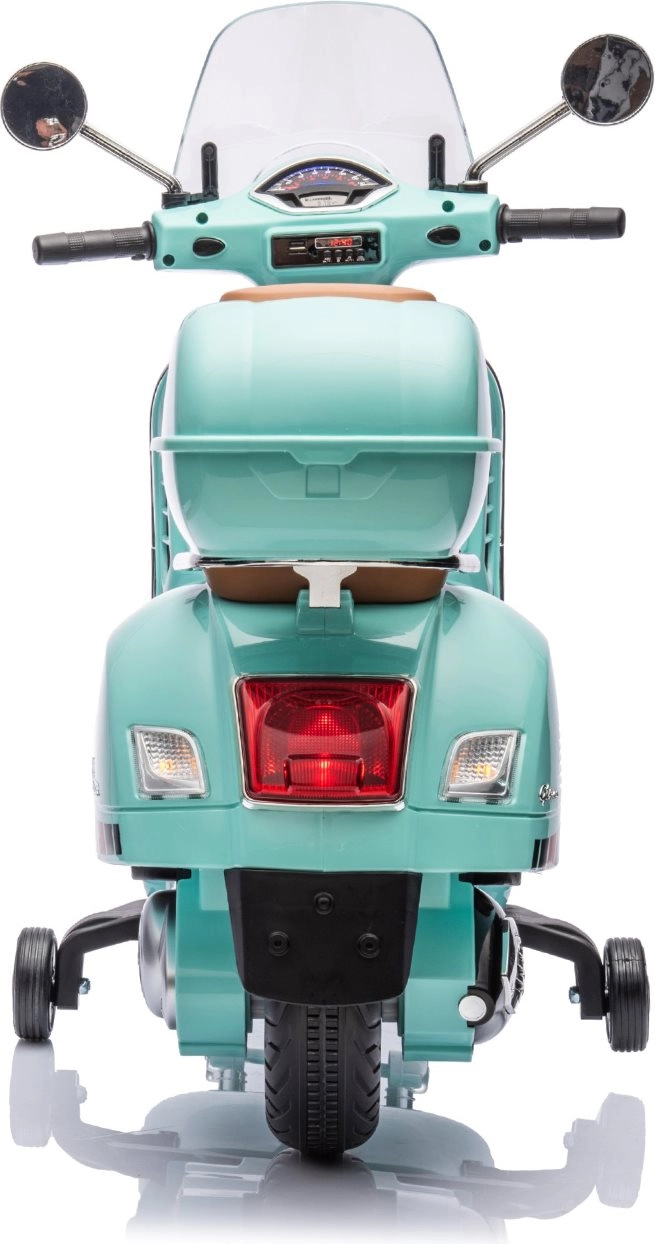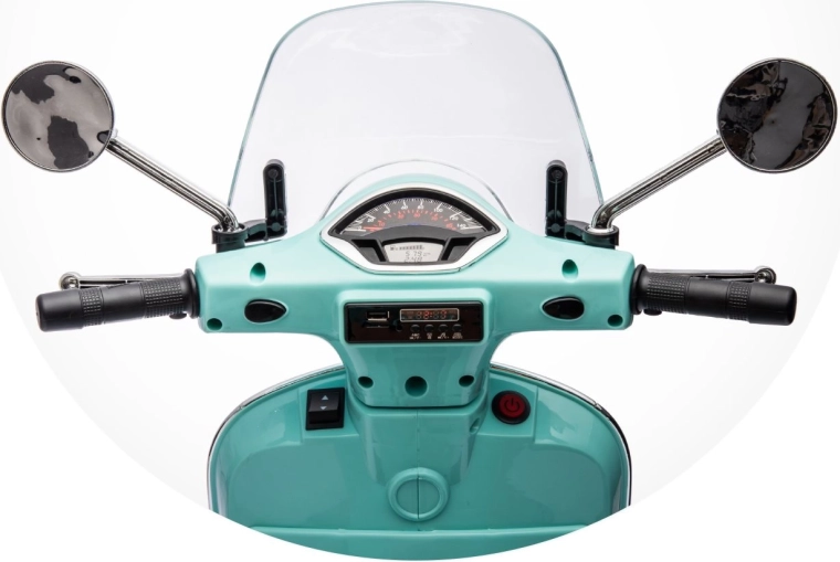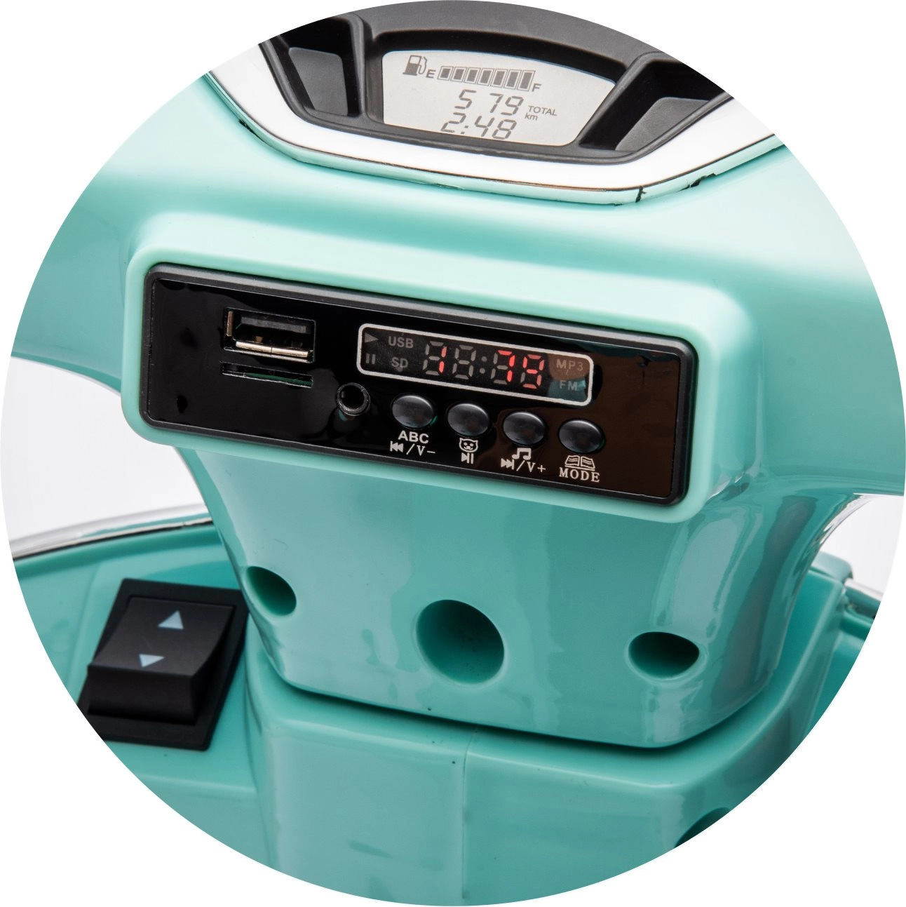 Motocicleta electrică pentru copii, inspirată de iconica VESPA GTS, îi va încânta pe micii șoferi prin aspectul realist și condusul sigur. Oferă două motoare 2 × 30 W, roți de sprijin, lumini LED, un scaun confortabil din piele ecologică și panou muzical cu USB/TF/MP3/AUX. Include și un portbagaj posterior, precum și efecte luminoase și sonore pentru distracție și mai mare.