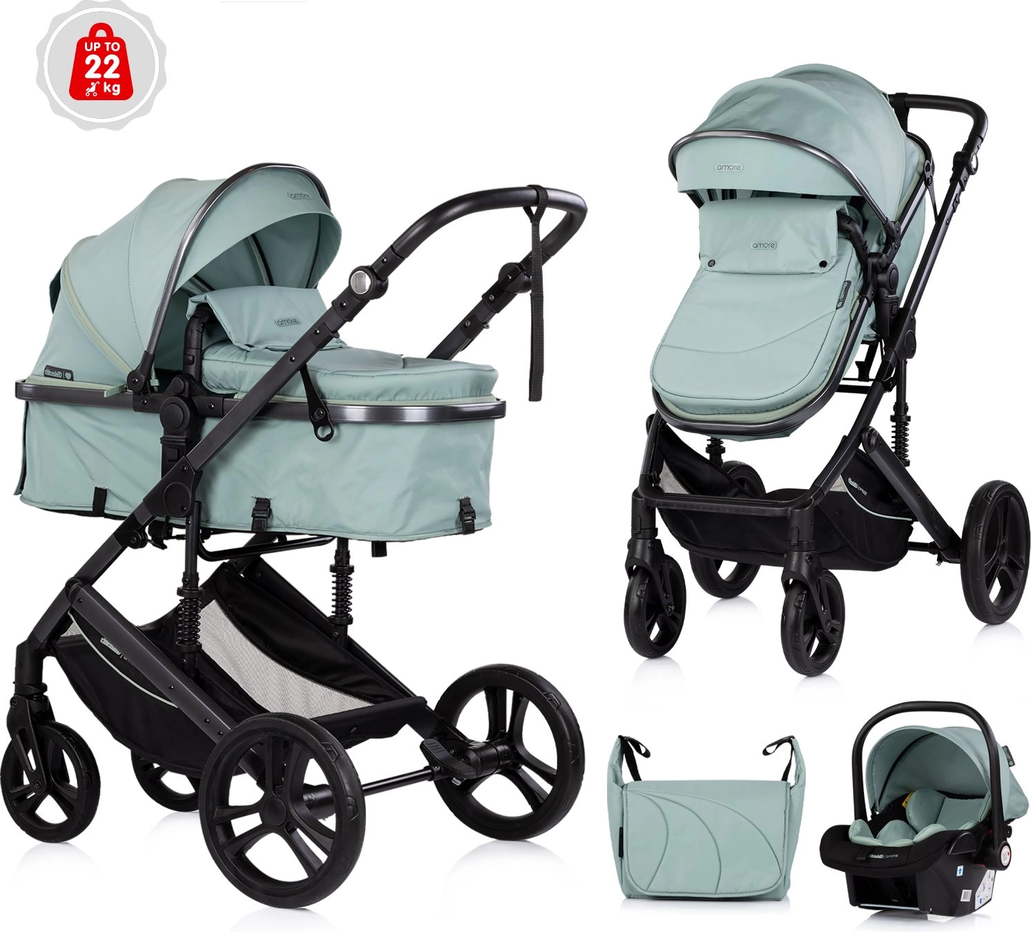 CHIPOLINO AMORE 2în1 este o soluție practică pentru nou-născuți și copii mai mari, până la 22 kg. Comutați ușor între landoul pentru bebeluș și unitatea sport pentru toddler. Construcția ușoară și robustă, cu suspensie integrată, face față orașului și trotuarelor mai dificile, în timp ce copertina mare, cu parasolar detașabil, protejează copilul în orice vreme.