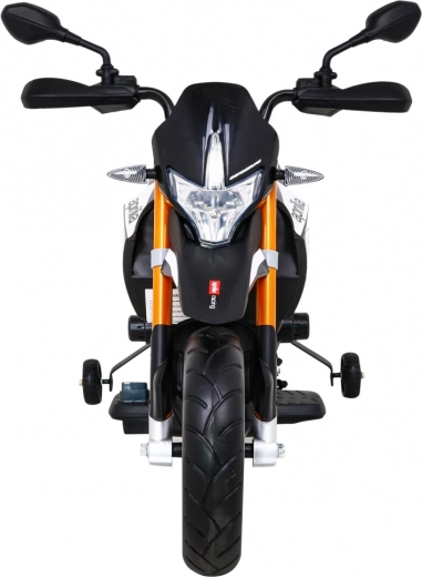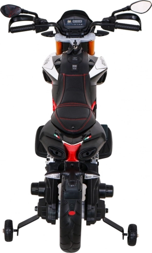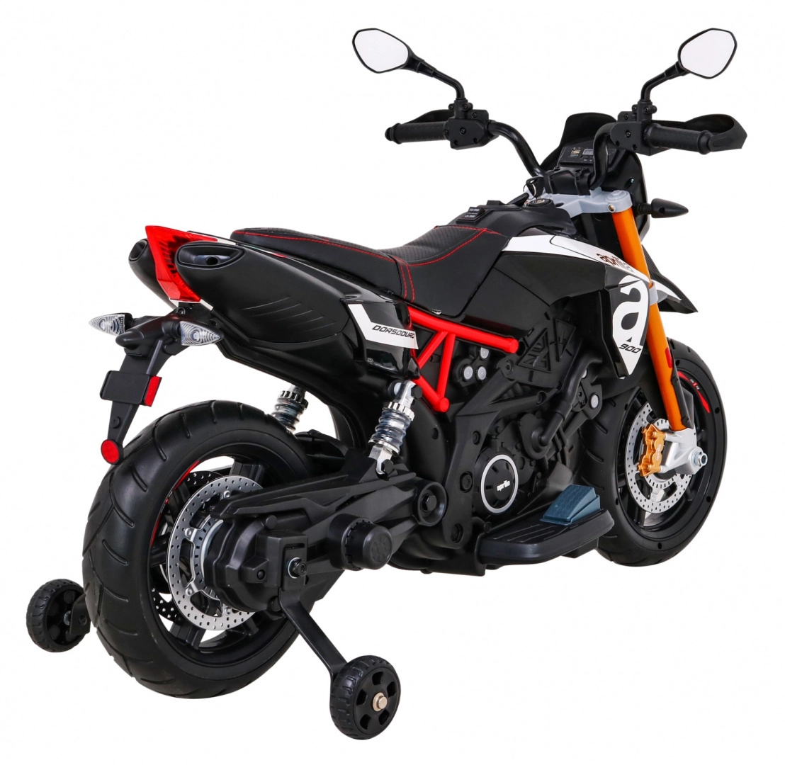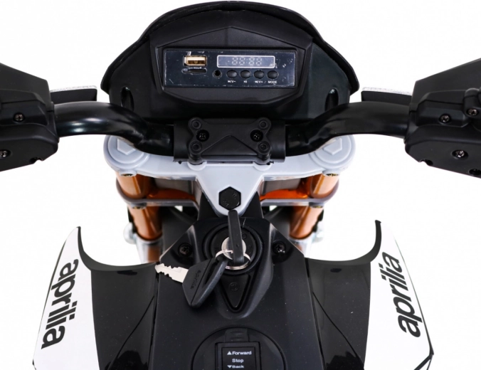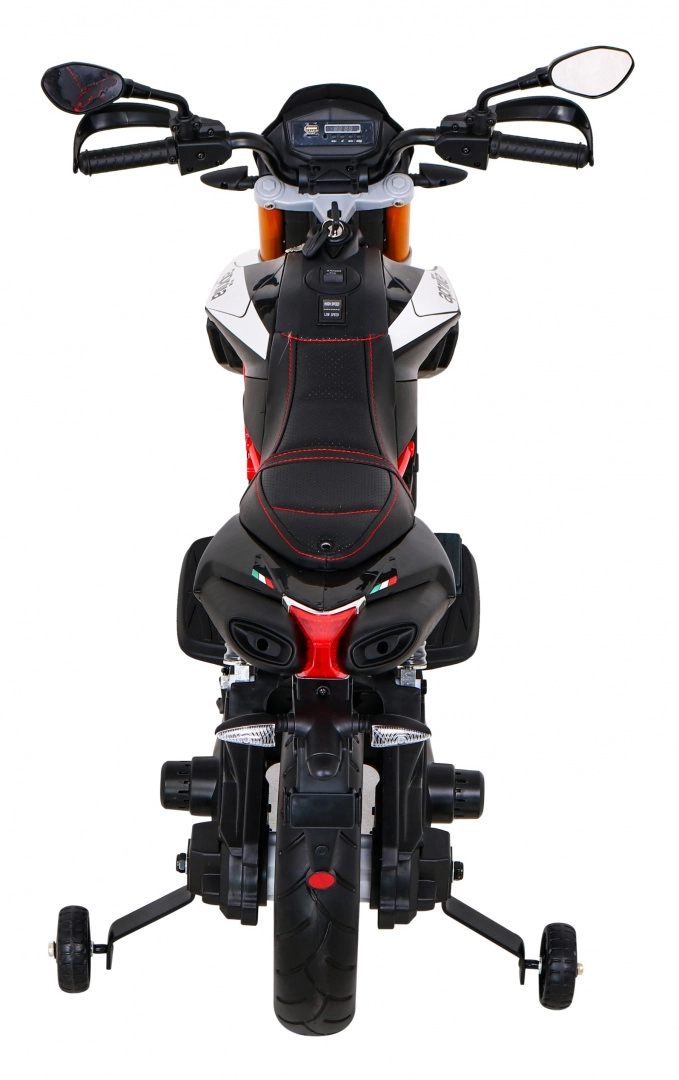 Motocicleta electrică pentru copii, stilată, APRIAILIA în culoare neagră îi va încânta pe micii piloți cu puterea 2×12 V / 25 W, cu roți EVA confortabile și cu pornire lină. Oferă două trepte de viteză, mers înainte/înapoi, faruri față și spate și dotări multimedia bogate MP3/SD/AUX/USB. Confortul este completat de un scaun din piele ecologică neagră, suspensie spate și indicator al nivelului bateriei.