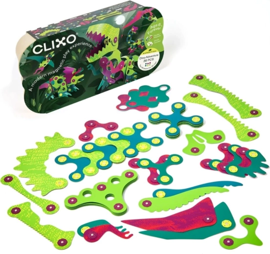 Setul magnetic Clixo cu tematica DINO stimulează creativitatea, motricitatea fină și imaginația spațială. Datorită magneților integrați, piesele se prind ușor din toate părțile, iar construcția flexibilă permite crearea de modele plane și 3D – de la dinozauri până la forme fanteziste originale.