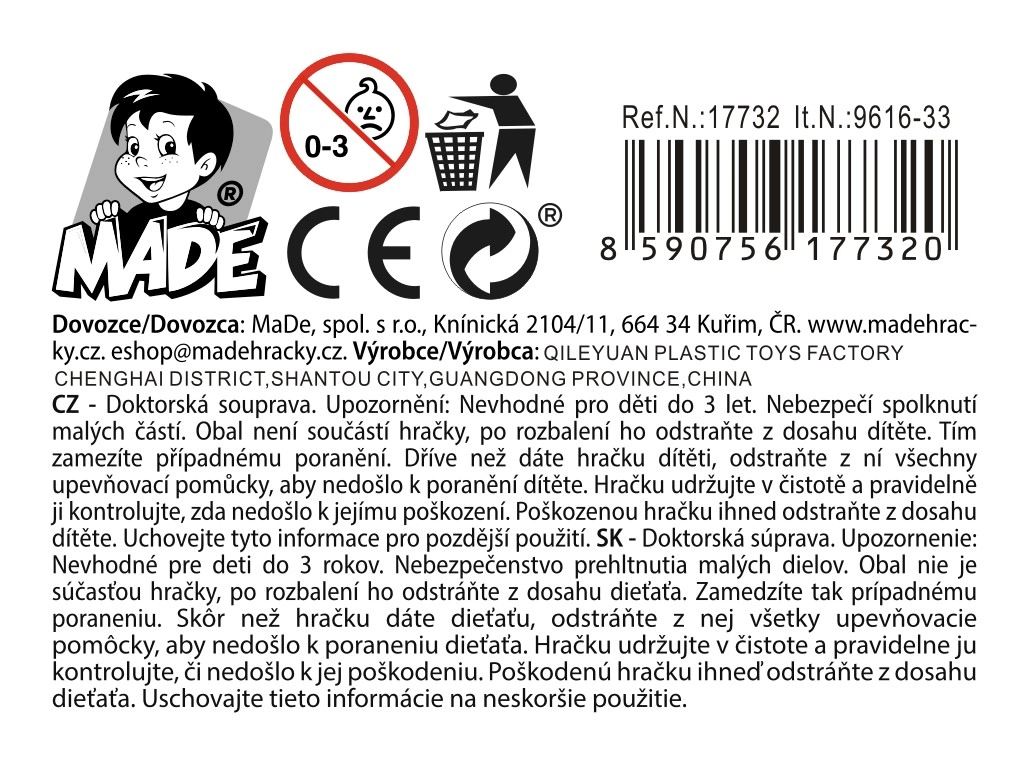 Acest set de doctor pentru copii de la 3 ani stimulează imaginația și dezvoltă abilitățile sociale. Conține 2 tipuri de instrumente medicale, este realizat din plastic de calitate și, datorită dimensiunilor sale compacte 17,5 × 15 × 4 cm, se transportă ușor. Nu are nevoie de baterii – distracția începe imediat după despachetare.