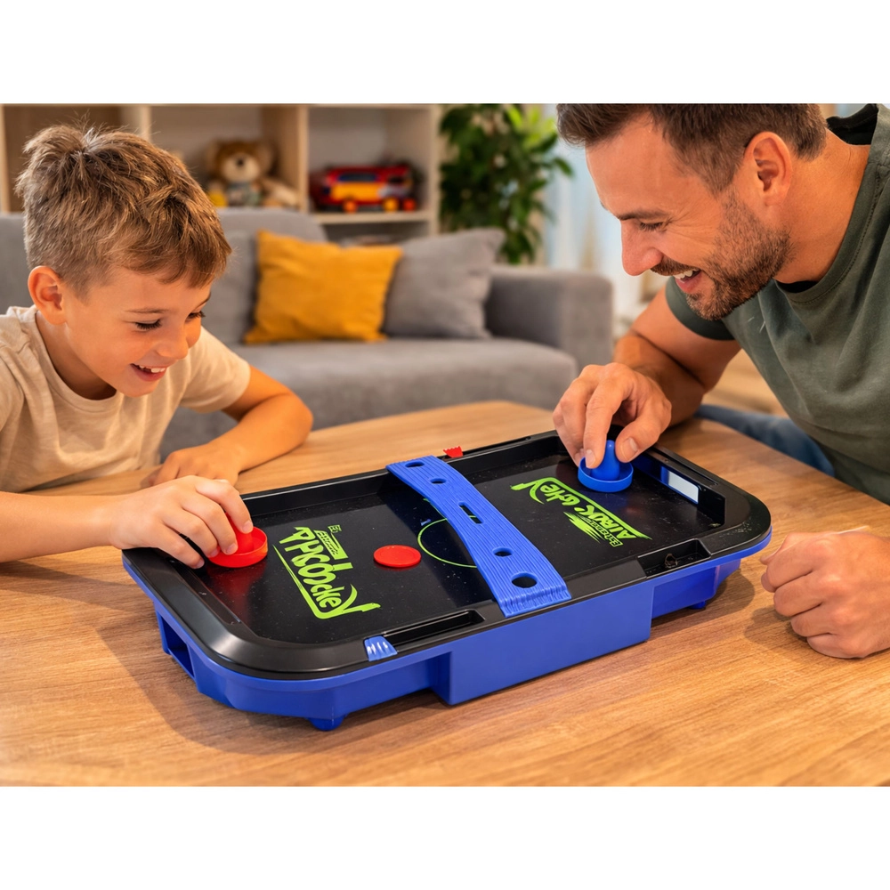 Air hockey-ul de masă compact oferă un joc rapid, dinamic și distractiv pentru copii și adulți. Datorită pernei de aer, pucul alunecă lin pe suprafață, jocul este fluid și palpitant. Ideal pentru camera copiilor și întâlniri de familie, dezvoltă reflexele și coordonarea mână–ochi.