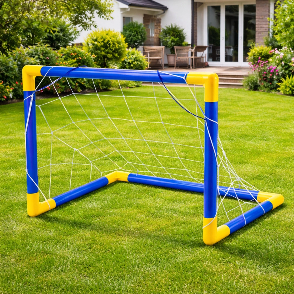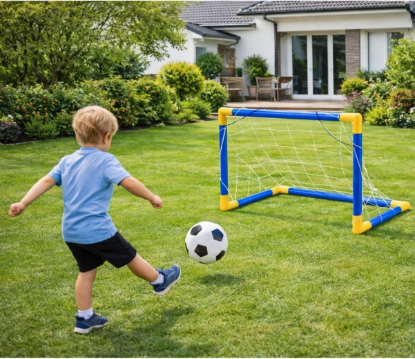 Poartă de fotbal pentru copii, ușoară și stabilă, cu accesorii complete – minge, pompă și plasă – pentru antrenament distractiv acasă și în aer liber. Montaj ușor, țevi din plastic rezistente și dimensiuni compacte care susțin mișcarea, coordonarea și precizia șutului.