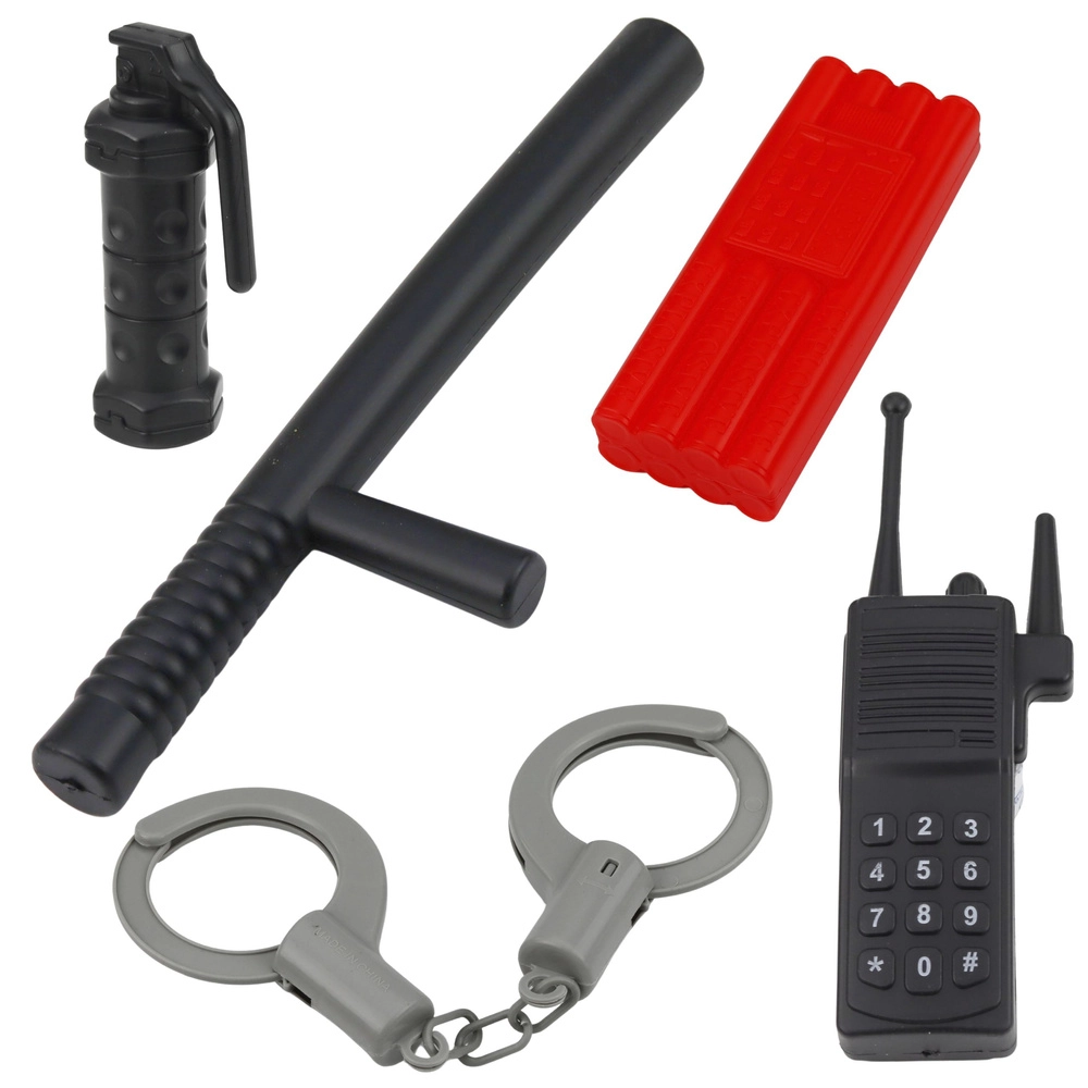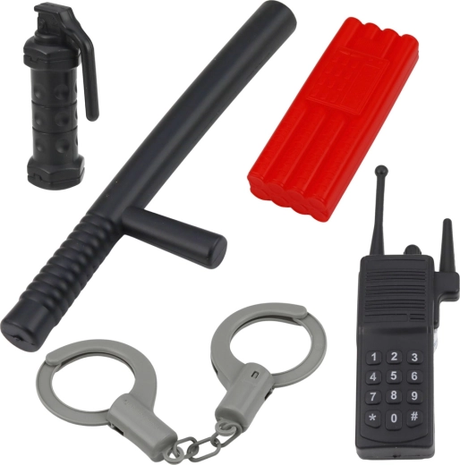 Sunt incluse accesorii realiste din plastic rezistent: pistol de jucărie, cătușe, stație radio, baston, semn STOP și ochelari/mască de protecție. Copiii pot exersa în siguranță munca în echipă, comunicarea și regulile de circulație.