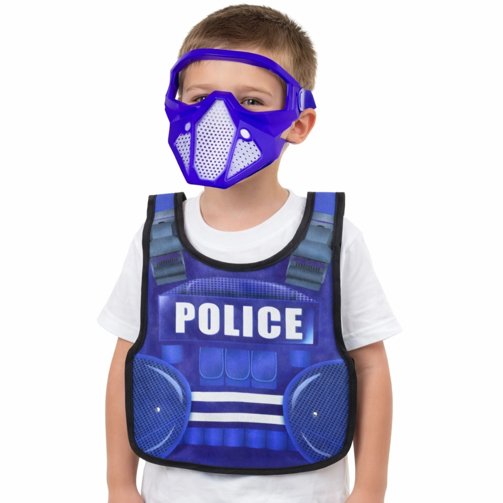 Masca/ochelarii cu orificii de aerisire și bandă reglabilă sporesc confortul chiar și în timpul jocului intens, iar vesta se potrivește bine copiilor de diferite mărimi.