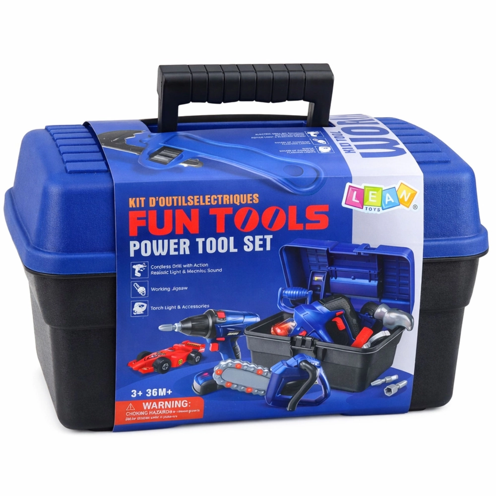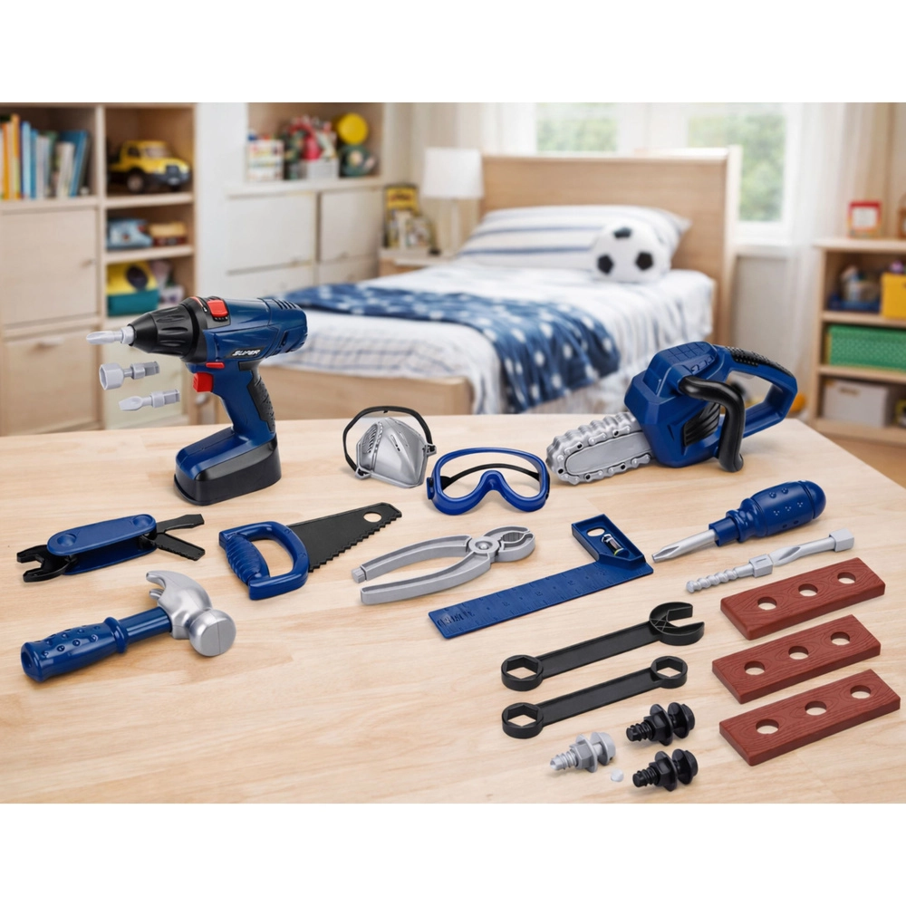Set practic de unelte pentru copii într-o cutie portabilă, care oferă până la 30 de piese pentru un joc realist de mic reparator. Include șurubelniță electrică, ciocan, fierăstrău, chei, șurubelniță, clește, elemente de montaj și chiar ochelari și mască de protecție. Plasticul ușor și rezistent asigură o utilizare sigură și confortabilă, iar cutia cu mâner facilitează organizarea și transportul.