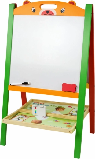 Cadrul robust din lemn natural este stabil și sigur, fără muchii ascuțite. Stativul pliabil economisește spațiu la depozitare. Pachetul include tot ce este necesar pentru utilizare imediată – magneți, marker lavabil cu radieră, cretă și burete.