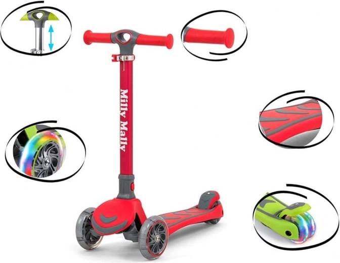 Trotineta pentru copii ușoară și rezistentă Milly Mally Boogie Scooter, în culoare roșie stilată, îi va încânta pe toți micii vitezomani. Are structură din aluminiu, 3 roți pentru stabilitate (spate dublu), roți față și spate luminoase din PU pentru o deplasare silențioasă și aderentă, ghidon reglabil pe 3 niveluri și frână pe aripa spate. Potrivită de la 3 ani, greutate suportată până la 50 kg.