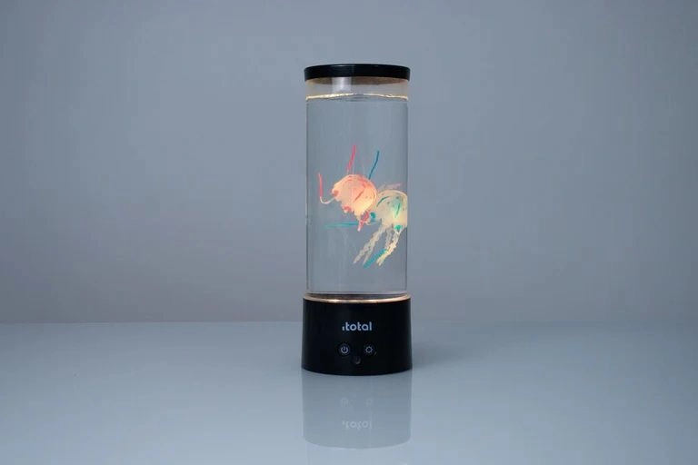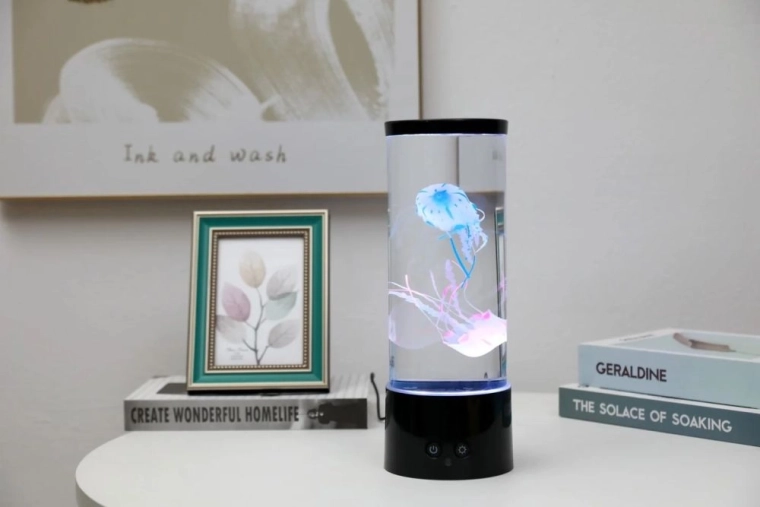 Mica lampă LED cu meduze plutitoare transformă interiorul într-o zonă de relaxare. Rezervorul cilindric transparent, cu iluminare delicată, creează impresia unui acvariu real fără grija întreținerii. Ideală ca decorațiune pentru dormitor, birou sau camera copilului (produsul nu este o jucărie).