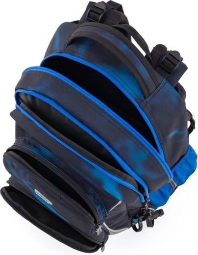 Panoul dorsal cu formă anatomică și bretelele de umăr amortizate, cu curea toracică, asigură confort chiar și la încărcături mai mari de rechizite.