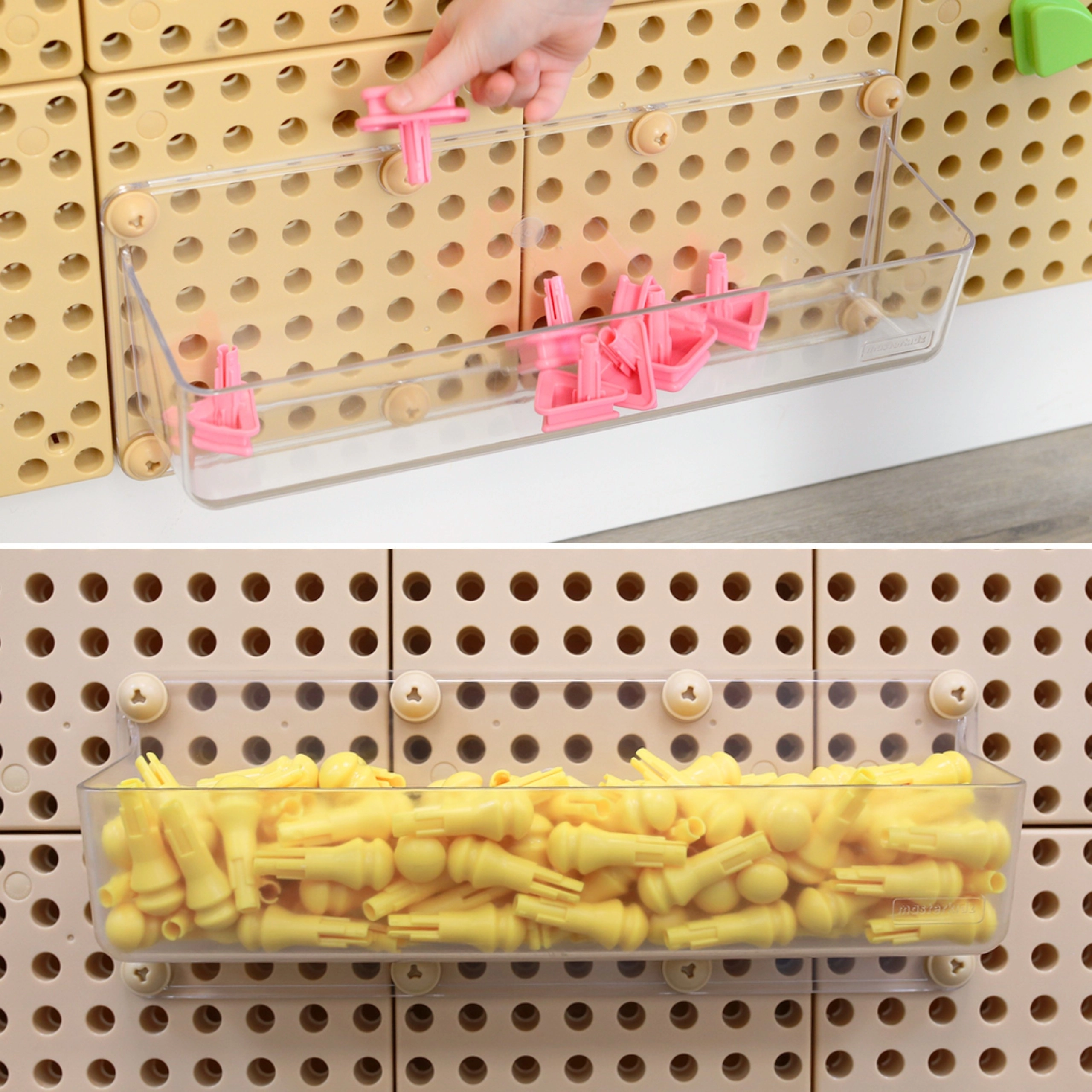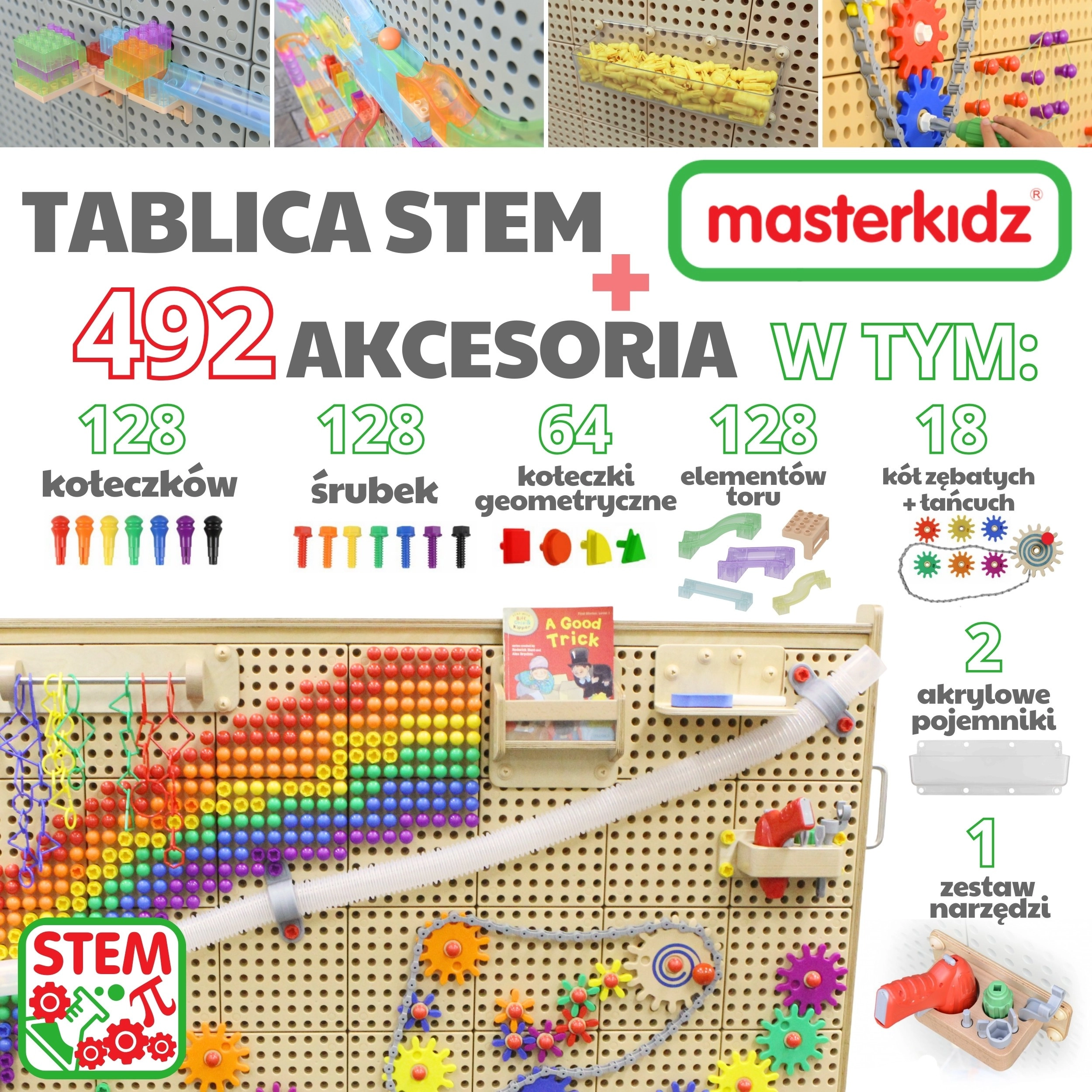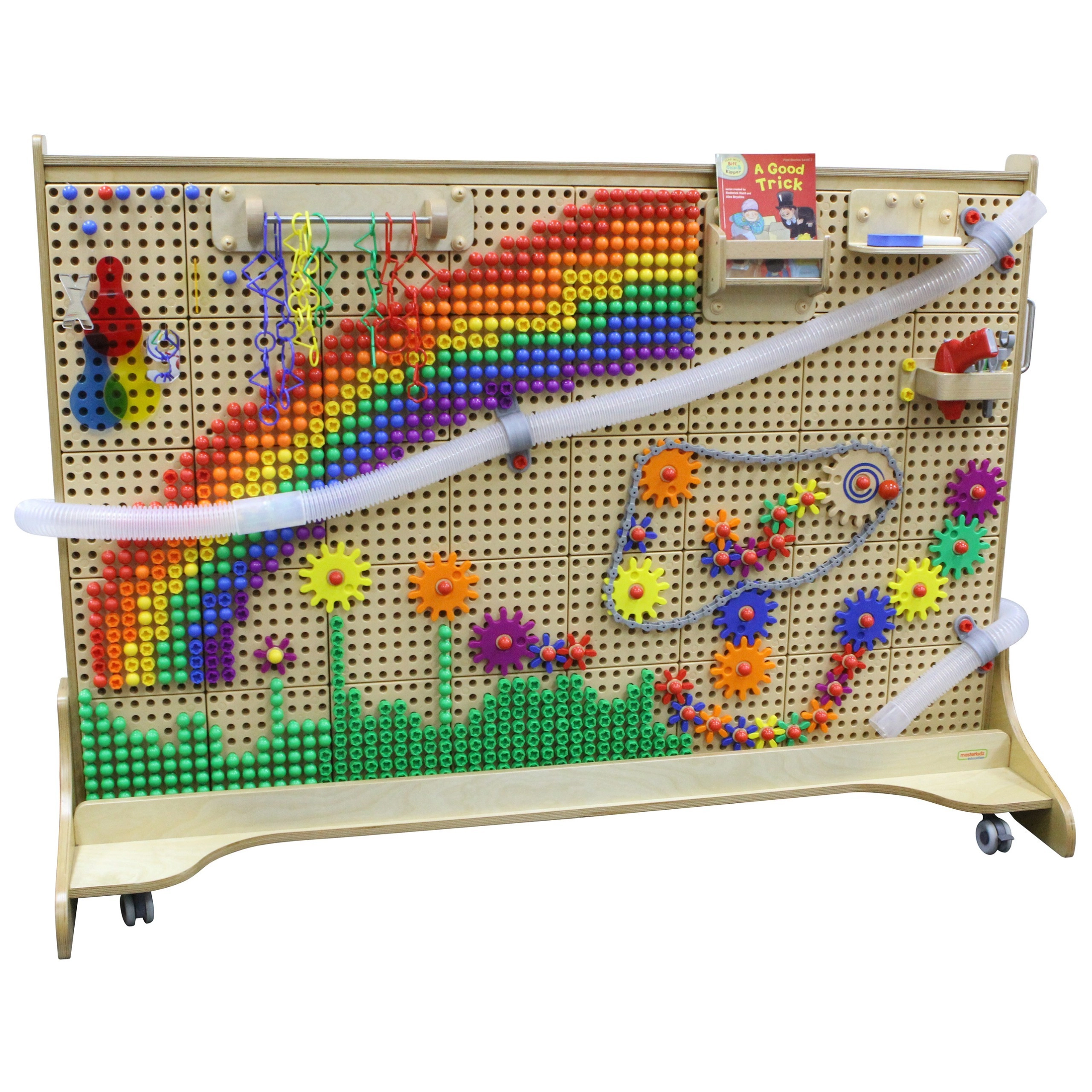 Acest set STEM complex oferă un panou perforat robust pe roți, care servește drept stație de construcție pentru roți dințate, șuruburi, pini, piste pentru bile și mozaicuri creative. Datorită setului bogat de accesorii, copiii înțeleg cu ușurință principiile cauză–efect, mecanicii și fizicii.