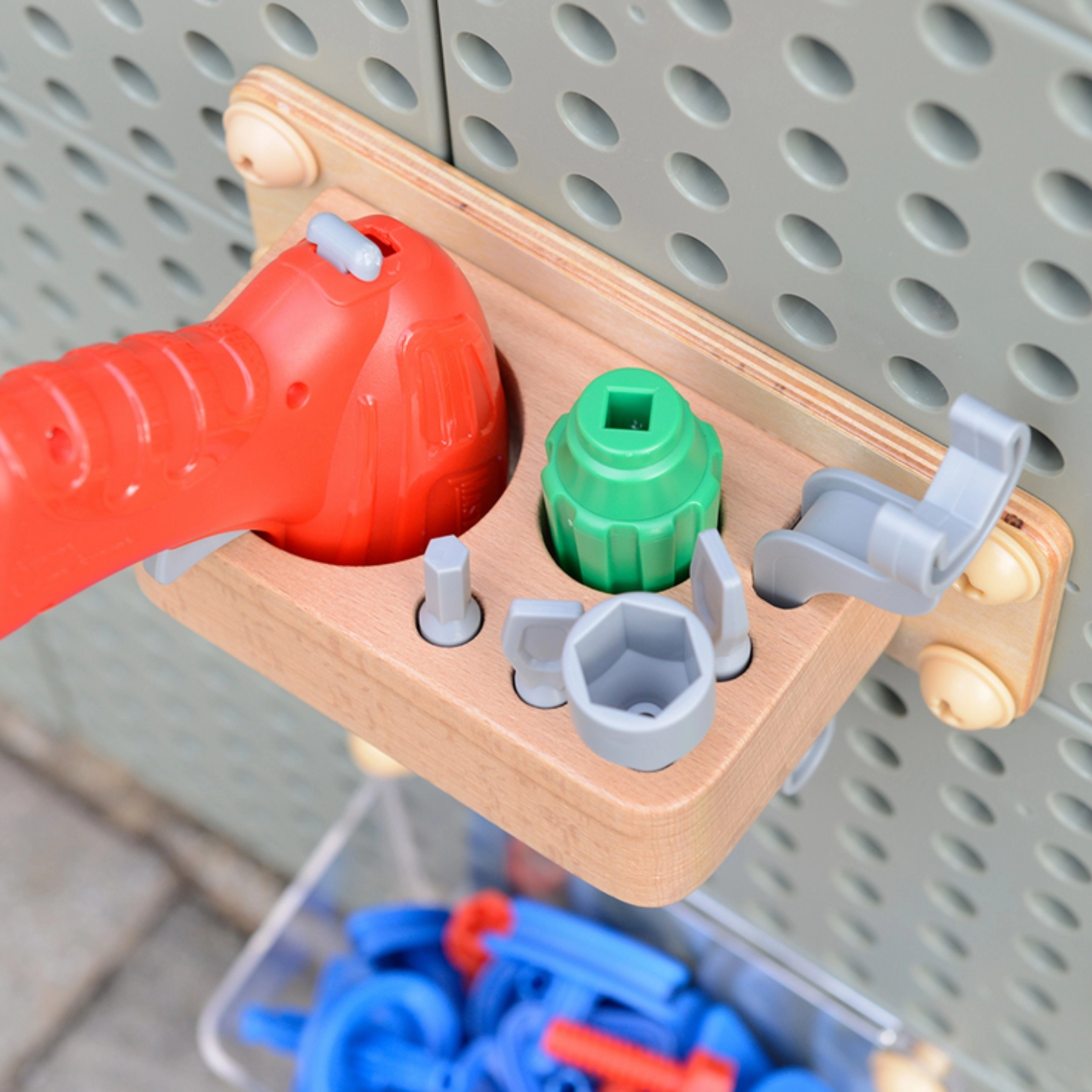 Sunt incluse burghiul pentru copii, șurubelnița și cheia pentru înșurubare reală, organizatoare tip tavă transparente, pini și șuruburi în culori vii, roți dințate cu lanț și o pistă modulară pentru bile. Sistemul modular încurajează experimentarea independentă, dezvoltă coordonarea mână–ochi, precizia și bucuria de a crea.