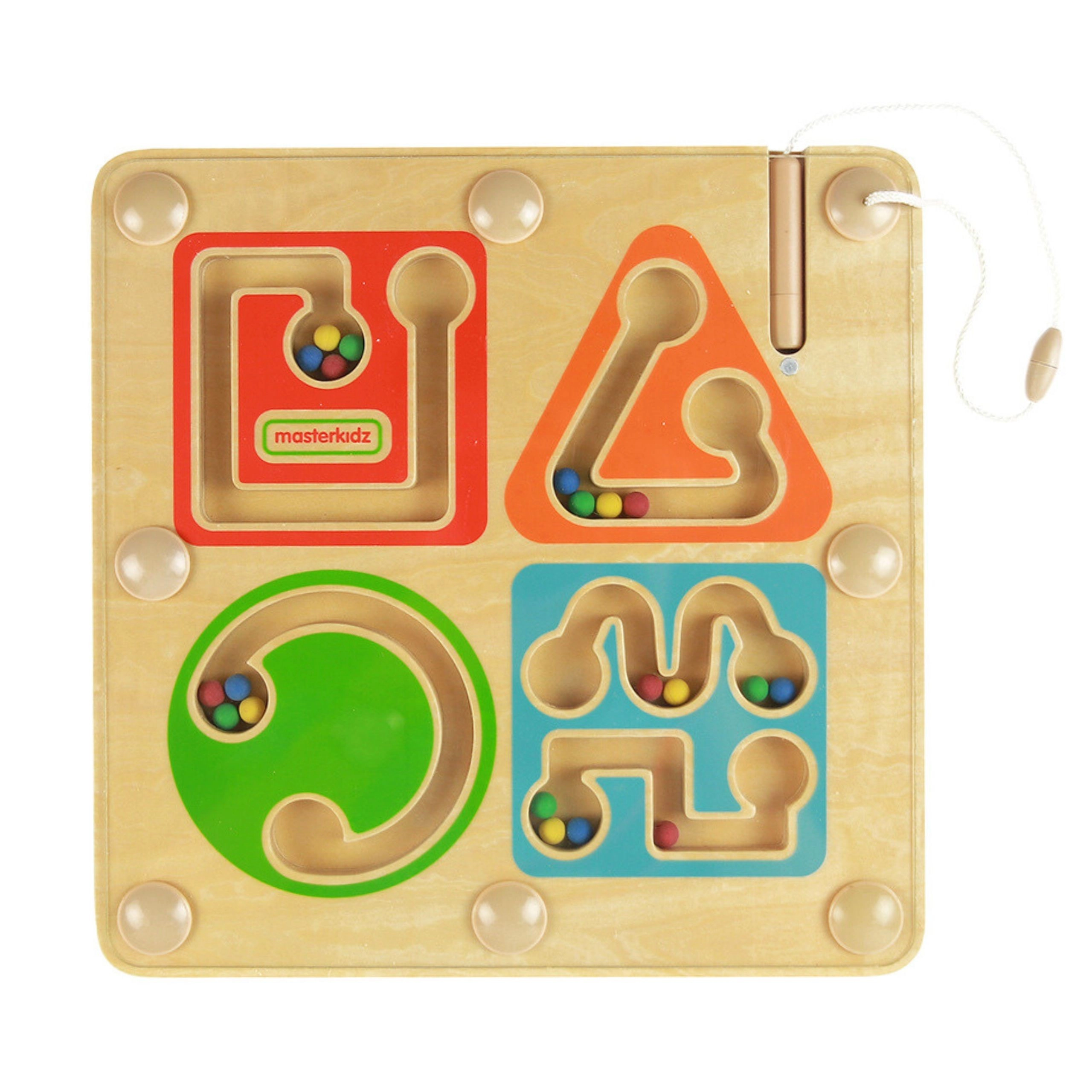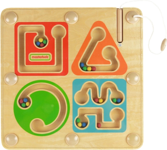 Labirintul magnetic din lemn de la MASTErKIDZ transformă primele încercări de scriere într-o joacă. Cu ajutorul stiloului magnetic cu șnur, copilul ghidează biluțele colorate prin patru trasee răsucite, antrenând astfel motricitatea fină, coordonarea mână–ochi și concentrarea. Datorită sistemului închis, biluțele rămân în siguranță în interior, iar jucăria este ideală atât acasă, cât și în călătorii.