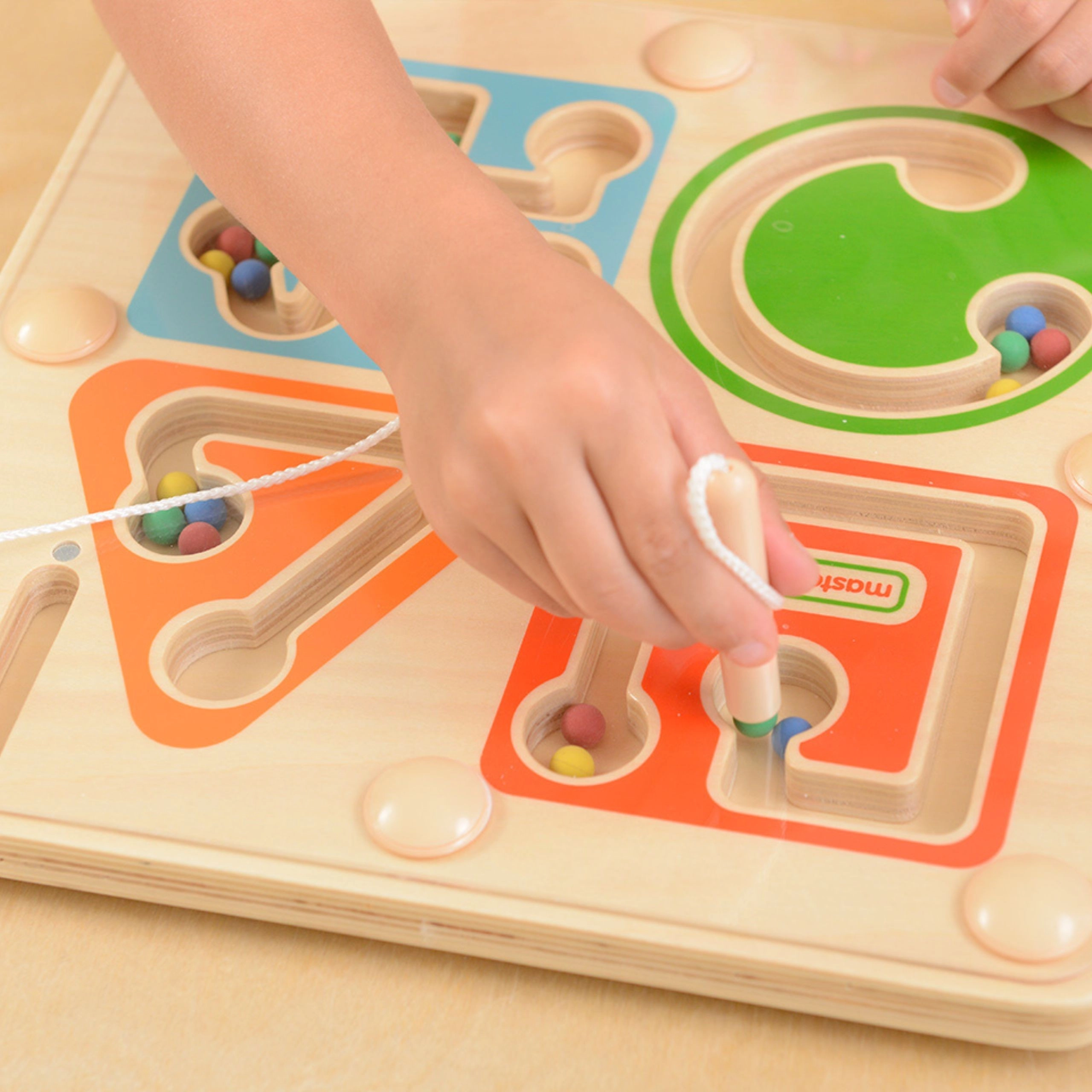 Structura stabilă din lemn și sistemul închis „self‑contained” asigură că nicio biluță nu se pierde. Jucăria dezvoltă: motricitatea fină, pregătirea pentru scriere, coordonarea mână–ochi, recunoașterea culorilor și a formelor și concentrarea.