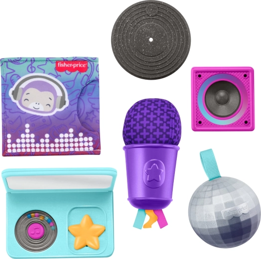 Microfon care pârâie/scoate sunet la apăsare, zornăitoare tip disco, „difuzor” din silicon, mușcătoare–disc și husă foșnitoare formează un set amuzant inspirat de muzică pentru explorare senzorială și joacă de rol.