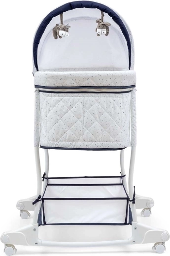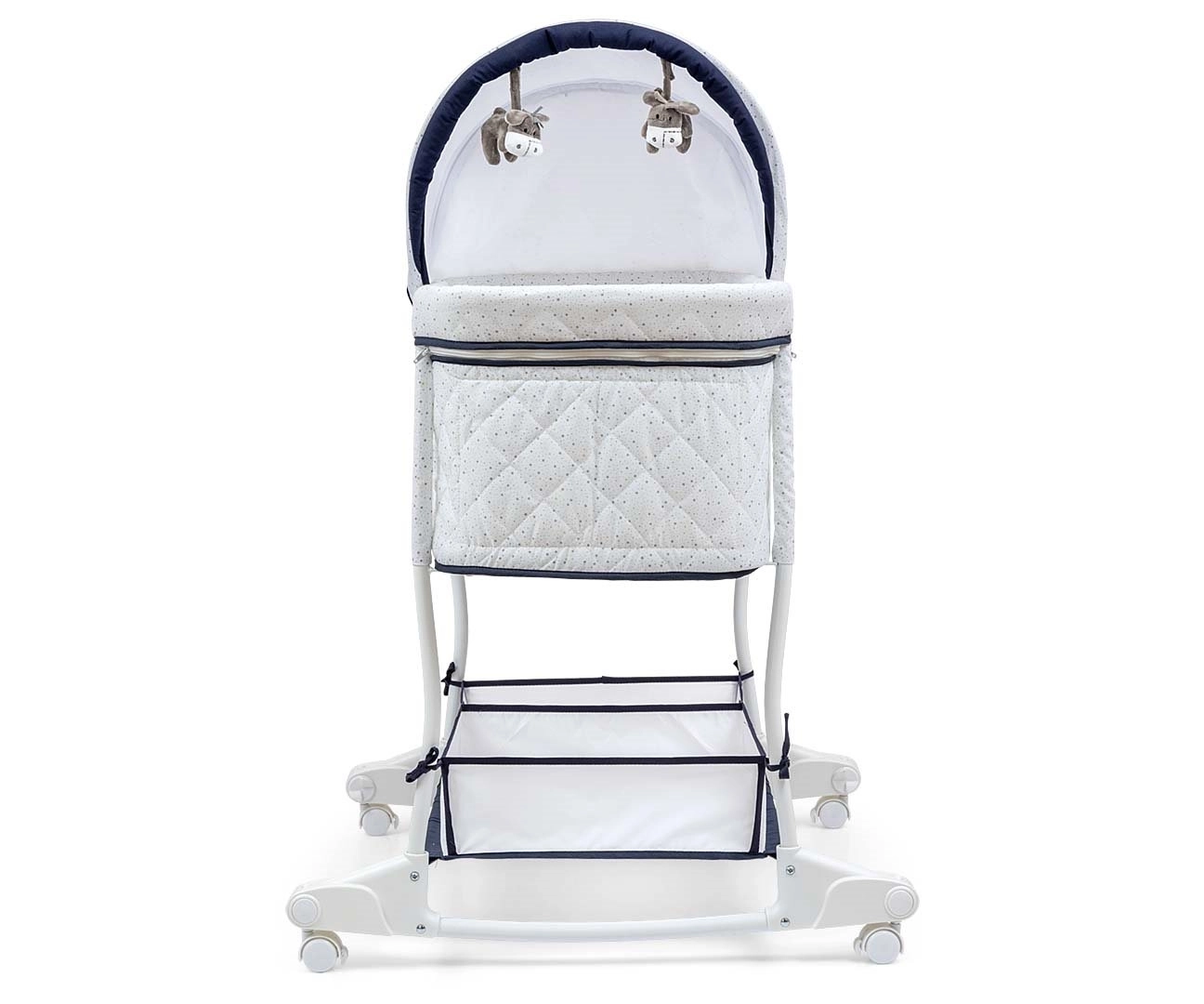 Salteluță moale, copertină detașabilă/rabatabilă cu jucării din pluș și coș inferior cu 2 compartimente pentru toate cele necesare.