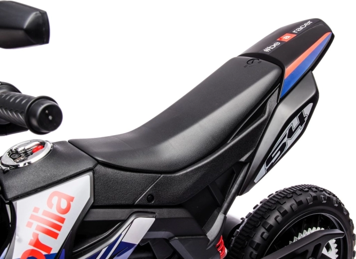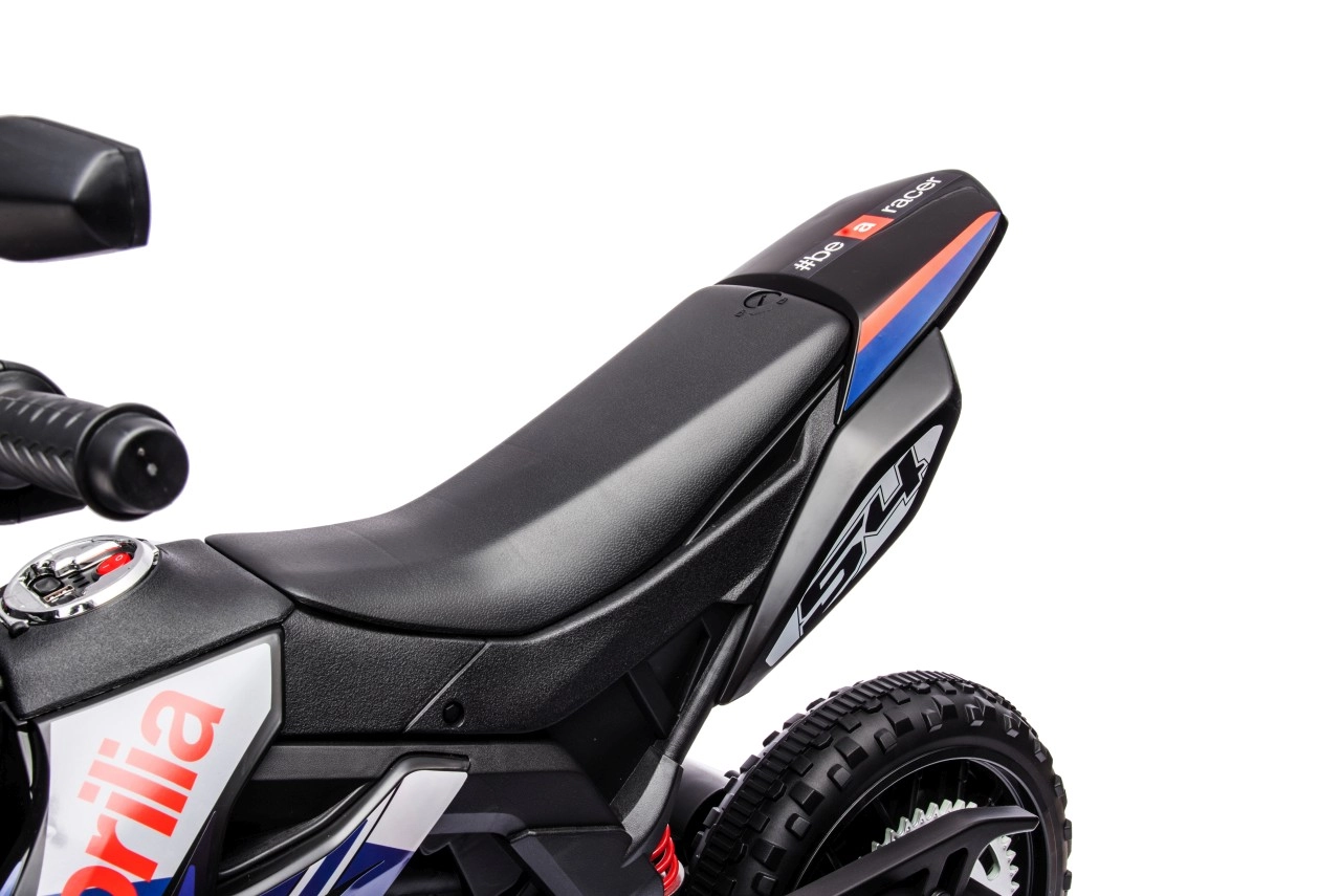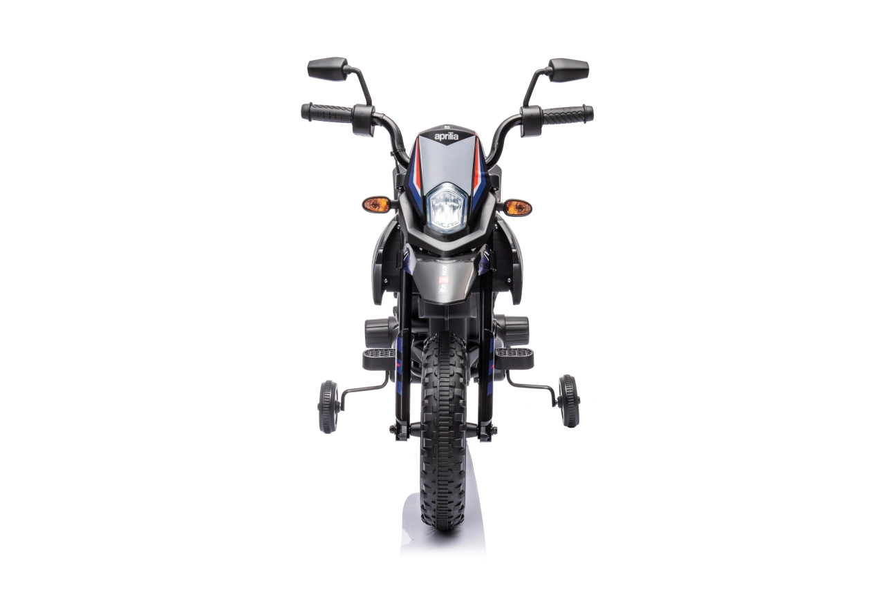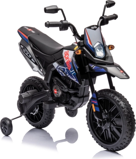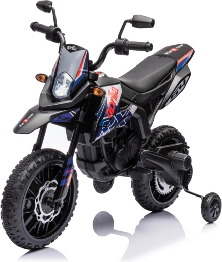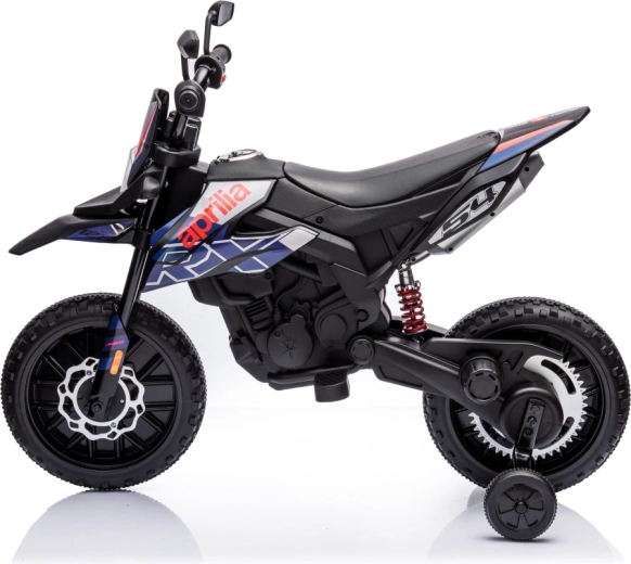 Motocicleta electrică pentru copii APRILIA RX, în culoare albastră, combină designul realist de off-road cu funcții sigure pentru începători. Două motoare de 35 W și acumulatorul de 12 V / 7 Ah asigură pornire lină și suficientă putere, în timp ce roțile laterale ajută la menținerea stabilității.