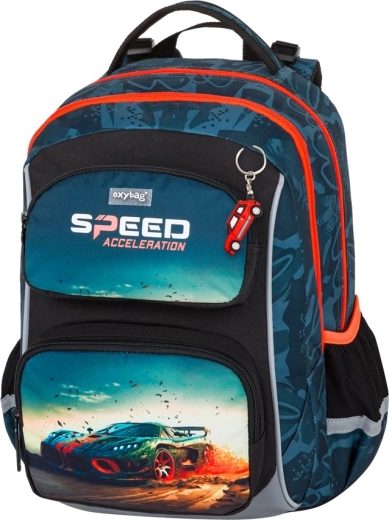 Compartimentarea practică, cu două compartimente spațioase, găzduiește manuale și caiete, în timp ce buzunarul frontal este ideal pentru cutia de gustare și mărunțișuri. Buzunarele laterale din plasă pot găzdui o sticlă cu apă, baza întărită impermeabilă protejează conținutul, iar elementele reflectorizante sporesc siguranța pe drumul spre școală. Setul include un penar cu un singur etaj și un săculeț pentru echipament sportiv cu închidere prin șnururi – toate asortate în același motiv „Speed Acceleration”.