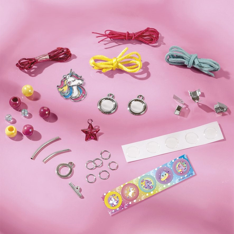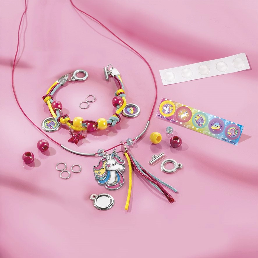 Acest set creativ fermecător aduce distracție dublă: realizarea bijuteriilor și decorarea poșetei. Copiii vor crea cu ușurință un brățară și colier cu mărgele și pandantiv unicorn, iar apoi vor decora poșeta textilă cu ajutorul nasturilor 3D, autocolantelor cu arici și pietricelelor strălucitoare în formă de inimă.