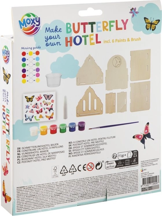 Descoperă bucuria creației și sprijină fluturii din grădina ta. Setul MOXY hotel din lemn pentru fluturi le permite copiilor și adulților să asambleze și să picteze propria căsuță din balsa ușoară. Datorită vopselelor acrilice incluse, poți crea un design unic, care se va integra frumos în exterior.