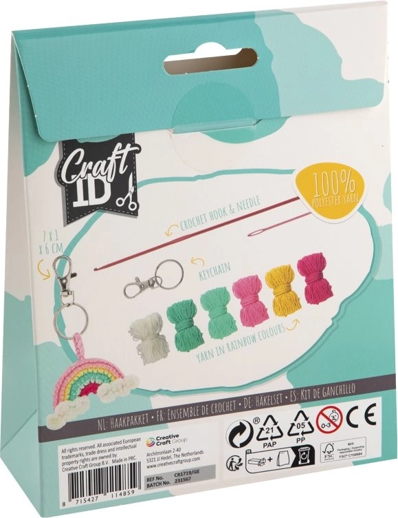 Creează-ți propriul breloc croșetat în formă de curcubeu cu acest set practic CRAFT ID. Ideal pentru începători și avansați, brelocul este drăguț, original și excelent ca dar. În pachet găsești tot ce ai nevoie: fir, umplutură, croșetă și ac din plastic, astfel încât poți începe imediat.