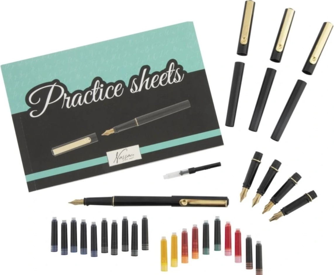Descoperă arta caligrafiei cu setul complet de caligrafie NASSAU. Acest set universal oferă 5 stilouri, 5 penițe interschimbabile și 20 de cartușe colorate pentru scriere fluidă, lettering și proiecte creative. Ideal pentru începători și avansați care își doresc linii elegante și precise, fără compromisuri.