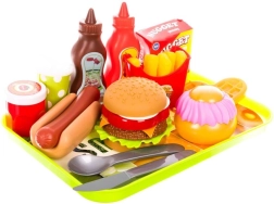 Set distractiv pentru micii bucătari, cu până la 26 de piese colorate pentru joc de tip fast food. Include tavă, hamburger, hot dog, cartofi prăjiți, wafer, băuturi și sosuri. Susține imaginația, motricitatea fină și jocul împreună cu părinții.