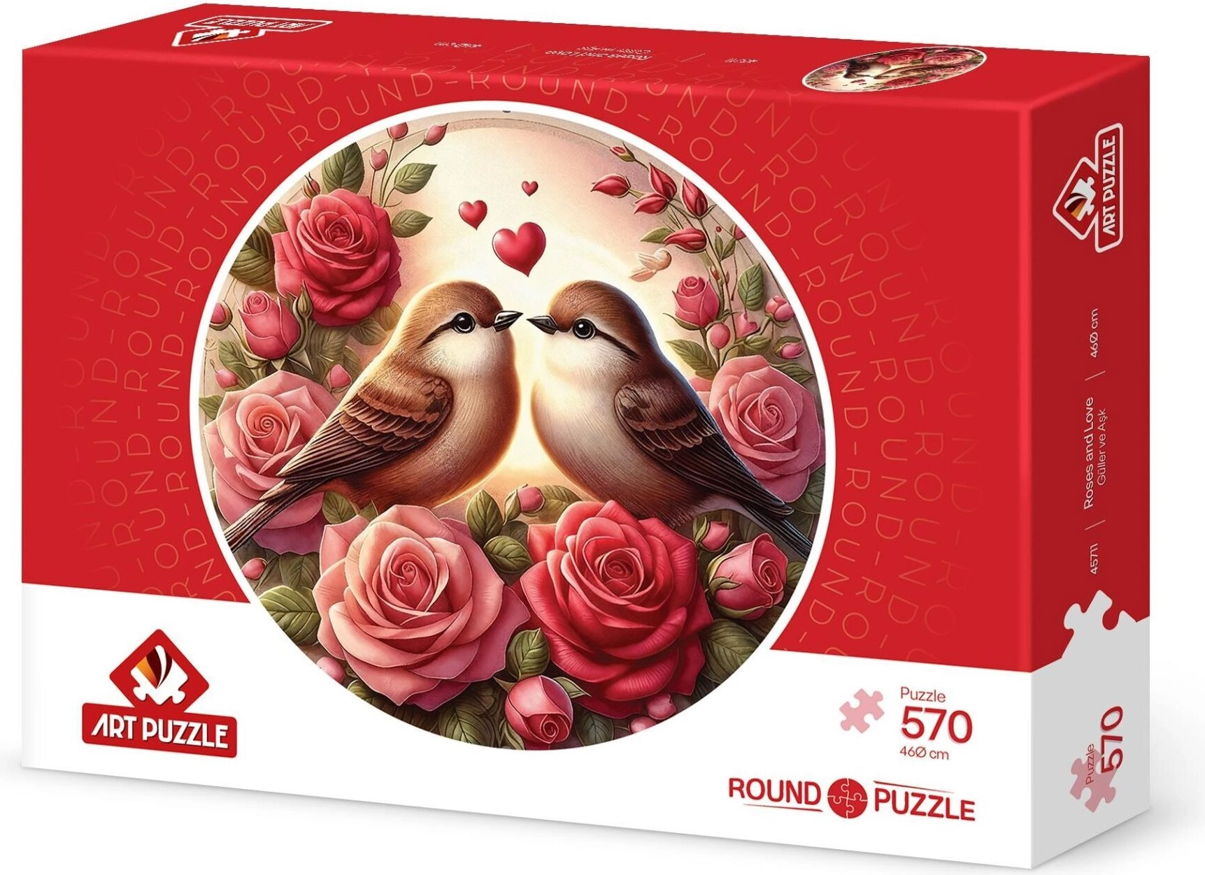 Descoperă puzzle-ul rotund romantic cu motiv de trandafiri, care va încânta iubitorii de flori și de puzzle-uri. Cu un diametru de aproximativ 46 cm și 570 de piese, oferă o provocare plăcută, imprimare de calitate și un rezultat decorativ elegant.