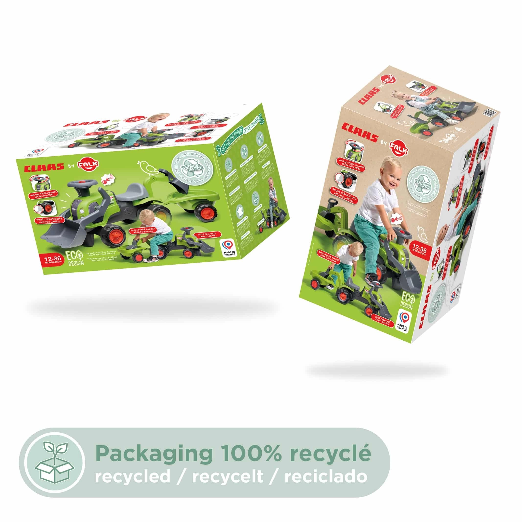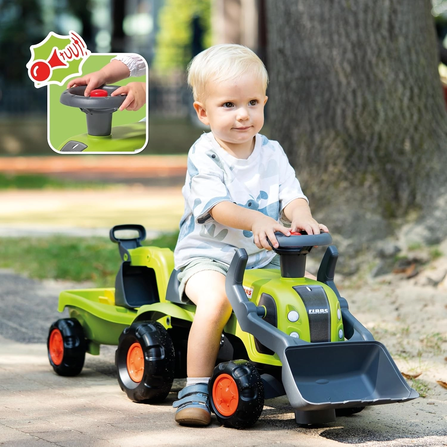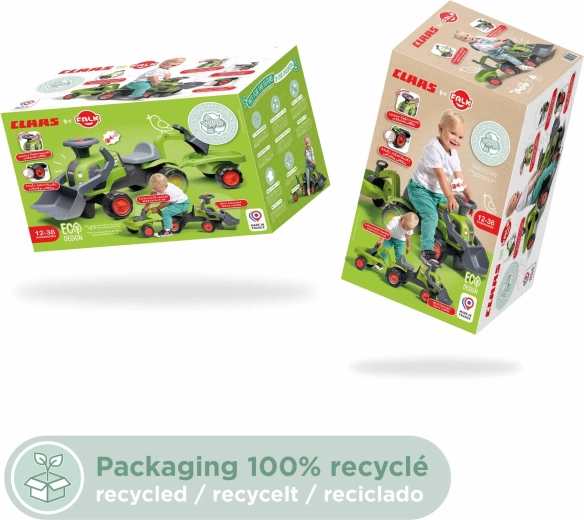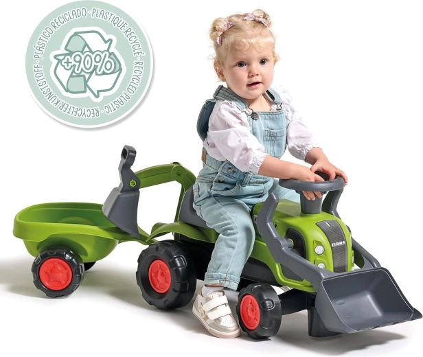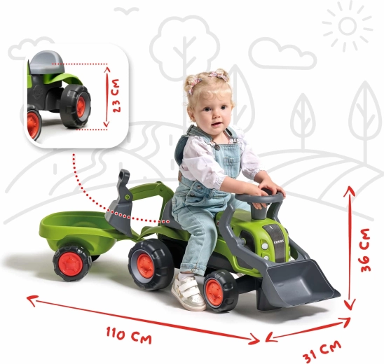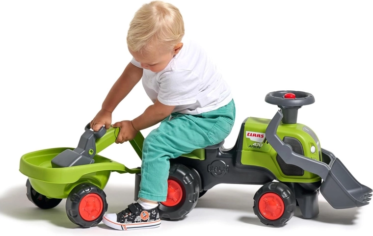 Pachetul include tractorul de împins licențiat CLAAS, remorcă detașabilă, cupă frontală, braț excavator posterior și volan cu claxon – gata de acțiune pe orice „șantier”.