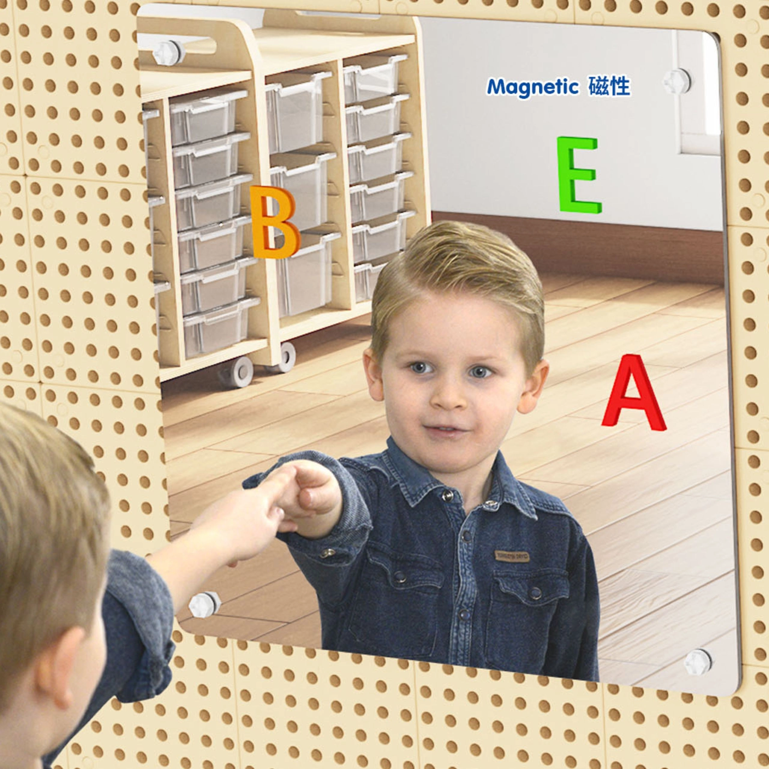 Oglinda magnetică mare MASTERKIDZ transformă orice sală de clasă sau colț pentru copii într-un centru interactiv de învățare. Suprafața magnetică unică permite fixarea literelor, cifrelor și a elementelor didactice, în timp ce copiii explorează mimica, emoțiile și coordonarea mișcărilor. Dimensiunea de 60 × 60 cm oferă suficient spațiu pentru activități de grup și individuale.