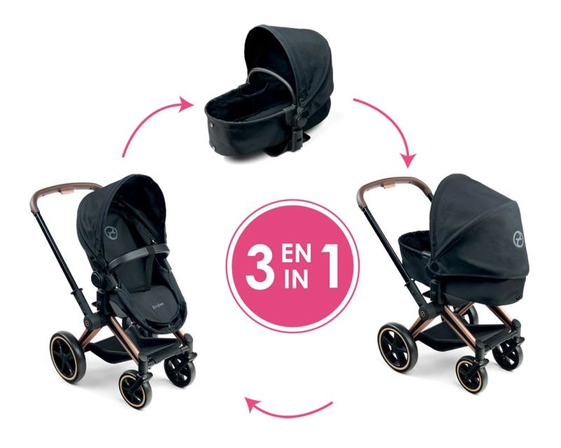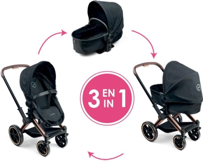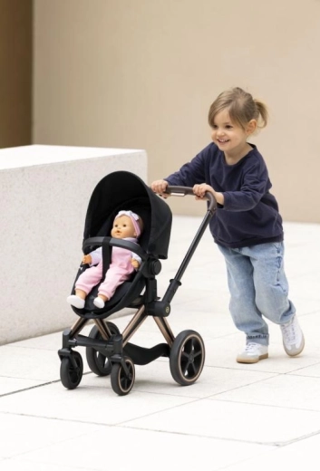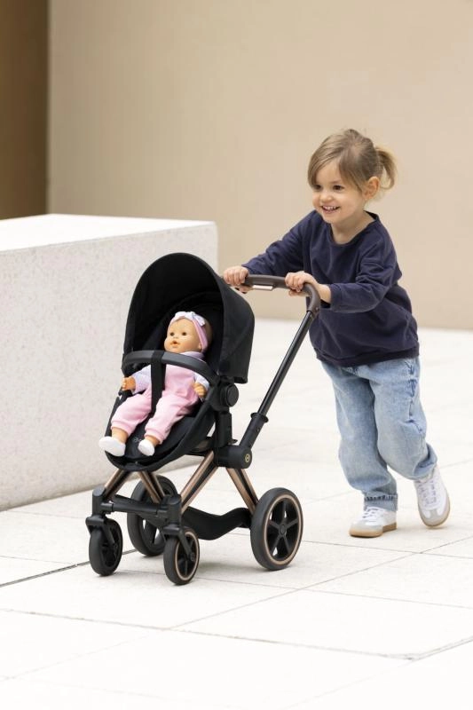 Căruciorul pentru păpuși CYBEX Black 3 în 1 a fost dezvoltat în colaborare cu brandul CYBEX și este fidel modelului iconic PRIAM. Astfel, copiii se pot bucura de jocul de-a părinții cu stil și funcționalitate ca la un cărucior adevărat. Datorită construcției bine gândite, poate fi folosit ca landou adânc, cărucior sport sau pătuț portabil confortabil.