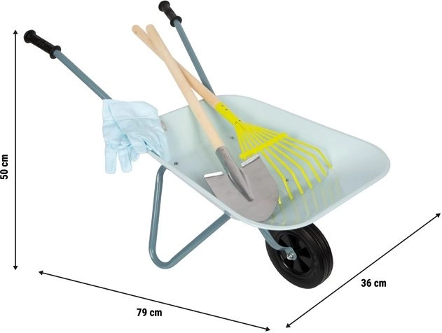 Descoperiți bucuria muncii în grădină cu acest set practic pentru micii grădinari: roabă metalică, lopată, greblă și mănuși. Datorită construcției metalice solide, mânerele confortabile din lemn și manevrabilității ușoare, este ideal pentru transportul pământului, frunzelor și încărcăturilor mici. O modalitate excelentă de a implica copiii în activități în aer liber și de a le dezvolta îndemânarea.