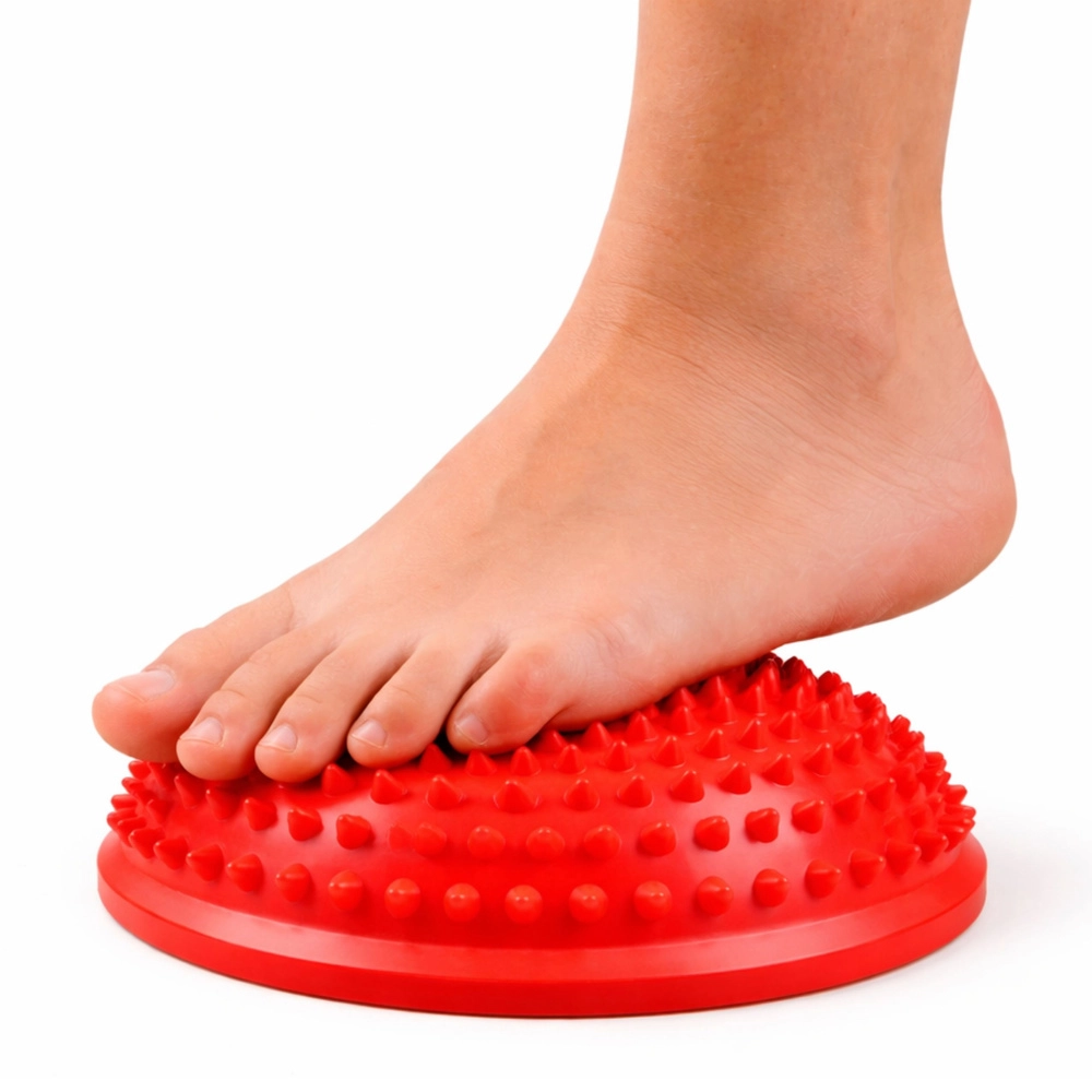 Această semisferă senzorială roșie este un accesoriu practic pentru întărirea zonei centrale a corpului, îmbunătățirea coordonării și eliberarea tensiunii musculare. Suprafața texturată cu proeminențe de masaj oferă o stimulare plăcută a tălpilor și ajută la activarea corectă a boltei plantare.